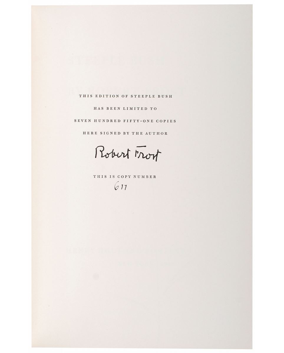 Signed book: Steeple Bush. Limited first edition, numbered 611/751. NY: Henry Holt and Company, 1947. Hardcover with slipcase, 6.25 x 9.5, 63 pages. Signed on the colophon in black ink. In fine condition, with blocks of uniform toning to first and last free end pages.