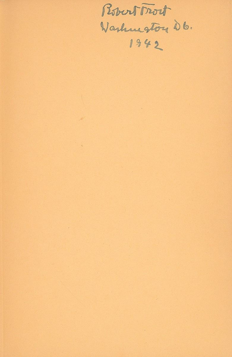 Signed book: A Witness Tree. Second printing. NY: Henry Holt and Company, 1942. Hardcover, 5.75 x 8.75, 91 pages. Signed on the first free end page in fountain pen, “Robert Frost, Washington, D. C., 1942.” In fine condition, with slight rubbing and sunning to the spine.