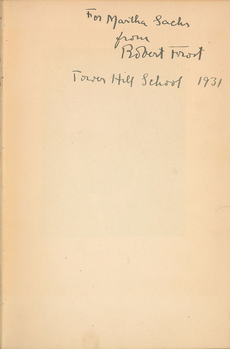 Signed book: Collected Poems of Robert Frost. First edition, first printing. NY: Henry Holt and Company, 1930. Hardcover, 6 x 8.75, 349 pages. Signed and inscribed on an opening page in fountain pen, “For Martha Sachs, from, Robert Frost, Tower Hill School, 1931.” Also includes an ALS signed “Elinor Frost,” three pages on two adjoining sheets, 5.25 x 6.75, January 29, 1931. Letter to Martha Sachs, in part: “I am answering your letter to my husband for him, as he seems to be exceptionally busy these days. He cannot say now, whether he will be able to reach Wilmington in time to visit the du Pont gardens. He thinks he has an engagement for lunch that day, in New York, and if so, it would be impossible. If he find that he can, he will wire you the night before from New York.” Autographic condition: fine. Book condition: VG-/None. The letter is in fine condition. Accompanied by the original mailing envelope, addressed in Elinor’s hand.