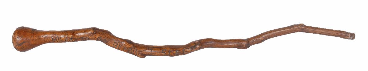 Robert Frost’s personally-owned and -used knotty wooden walking stick, measuring approximately 39? long, carved along one side with “R. Frost” and along the other with a famous line from the poem ‘Stopping by Woods on a Snowy Evening,’ “Miles to go before I sleep.” In fine condition. Accompanied by a notarized letter of provenance, in part: “This walking stick was acquired by me from Robert Graham Chase’s Estate. Mr. Chase, was a personal friend of Robert Frost when he lived in Franconia and Vermont. According to him, Frost owned and used this walking stick when he lived in Vermont while at Dartmouth College.” Also includes photocopies of a book inscribed to Chase by Frost. Chase studied book design with Ray Nash at Dartmouth and was later a noted antiques dealer. While the maker of the cane is unknown, it was presumably created by one of his admirers and given as a tribute to the great poet. In Frost’s essay ‘The Figure a Poem Makes,’ published as an introduction to the 1939 edition of his Collected Poems, he comments, ‘We enjoy the straight crookedness of a good walking stick.’ A unique relic with an ideal relationship to Frost’s life and work.