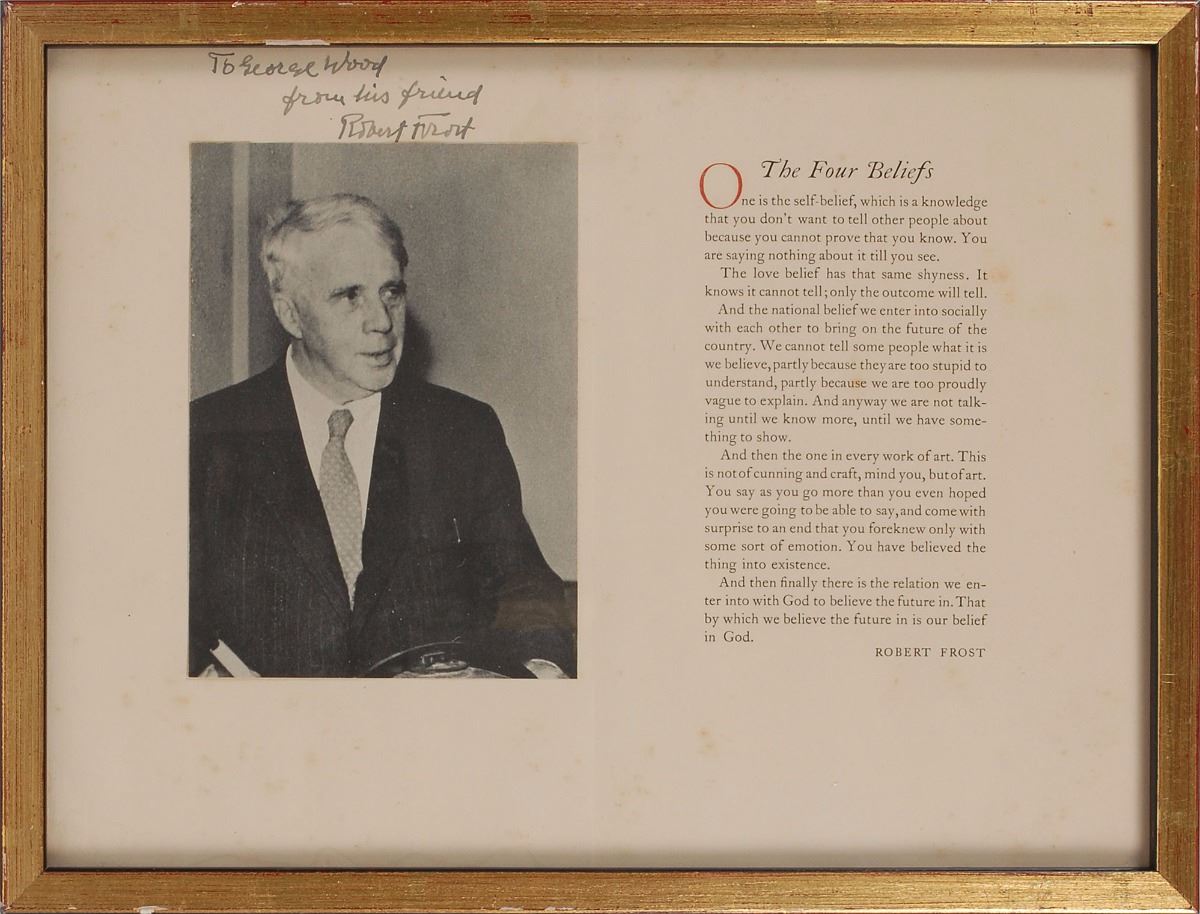 Matte-finish 4 x 5.75 photo of Frost in a suit and tie, affixed to the opening page of his 1944 essay The Four Beliefs, signed and inscribed on the page in fountain pen, “To George Wood, from his friend, Robert Frost.” Framed to an overall size of 12.75 x 9.75. In fine condition, with some scattered light foxing.