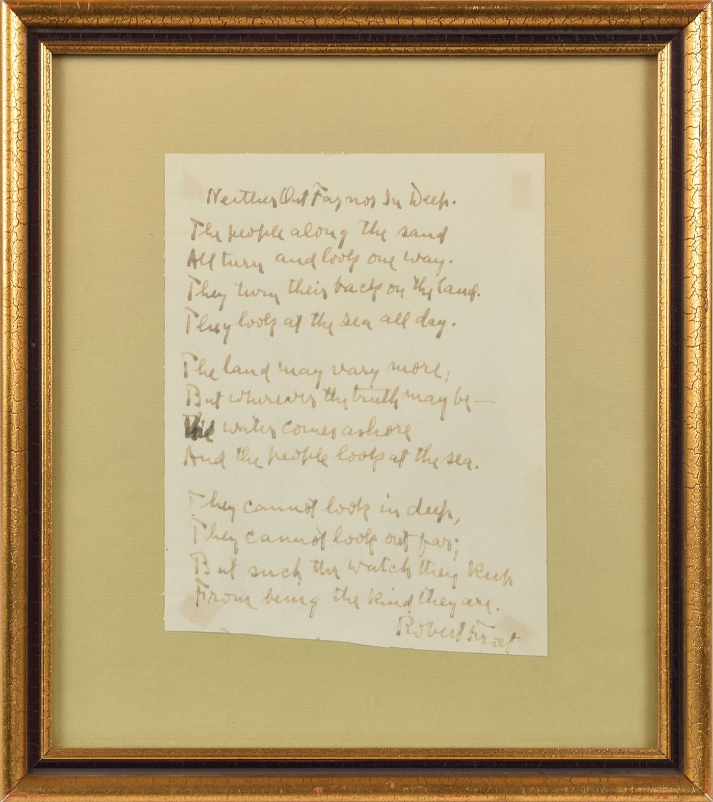 Wonderful handwritten poem by Robert Frost, entitled "Neither Out Far nor In Deep," one page, 5.5 x 7, no date. The three stanza poem, in full: "The people along the sand / All turn and look one way. / They turn their back on the land. / They look at the sea all day. / The land may vary more; / But wherever the truth may be— / The water comes ashore / And the people look at the sea. / They cannot look in deep, / They cannot look out far; / But such the watch they keep / From being the kind they are." Signed at the conclusion by Frost. Framed to an overall size of 10.25 x 11.25. In fine condition, with the lower edge irregularly trimmed, and light show-through from mounting traces on the reverse corners. First published in 1936, Neither Out Far nor In Deep is a wonderfully cryptic little poem, and an ideal example of original Frost verse.
