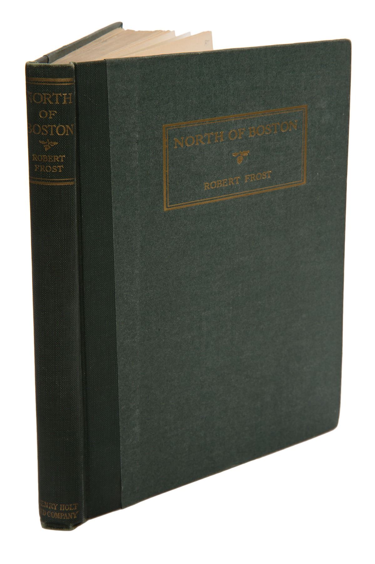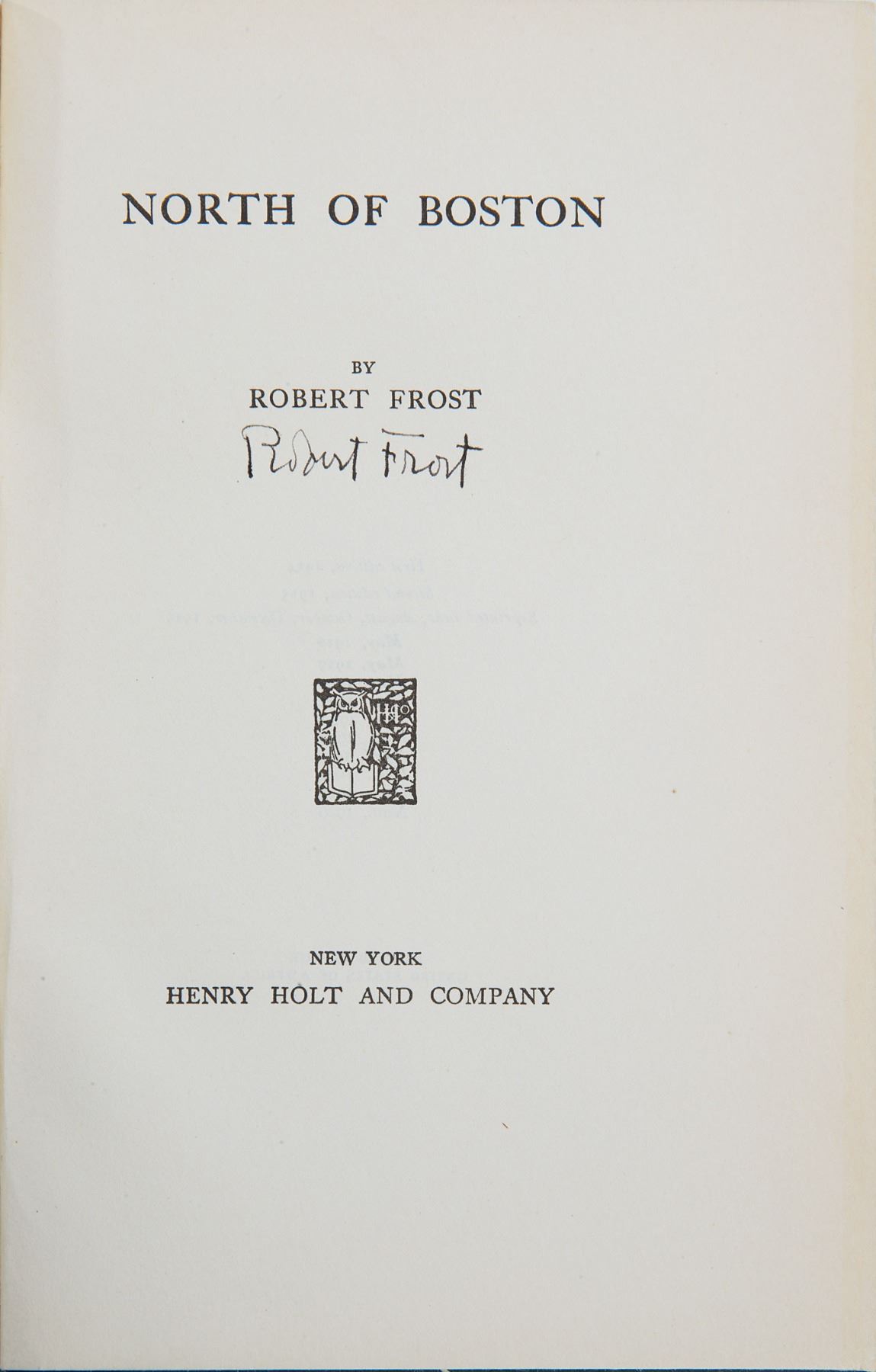 Signed book: North of Boston. Later printing. NY: Henry Holt and Company, 1926. Hardcover, 6 x 8.75, 137 pages. Signed on the title page in fountain pen by Robert Frost. Affixed to the front pastedown is a hand-drawn bookplate labeled "C. Bradford Mitchell." Autographic condition: fine. Book condition: VG+/None. A beautiful, crisply signed edition of Frost's second poetry collection.