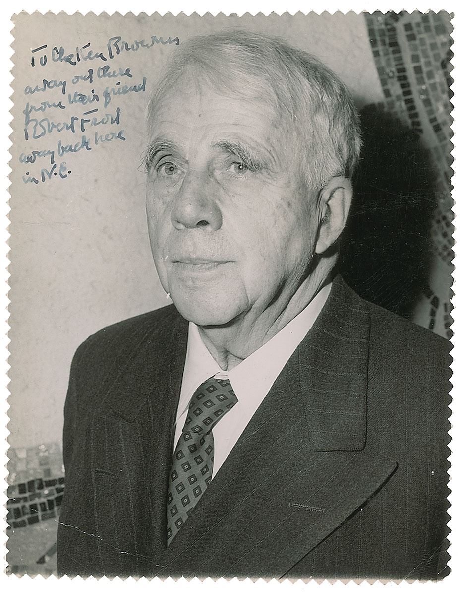 Vintage glossy 6.5 x 8.25 photo of Frost in a suit and tie, signed and inscribed in fountain pen, "To the Ken Brownes, away out there, from their friend, Robert Frost, away back here in N.E.” Reverse bears a typed collector's notation indicating that it was received in 1950. In very good condition, with homemade deckle-edges, overall creasing, and crazing to the emulsion.