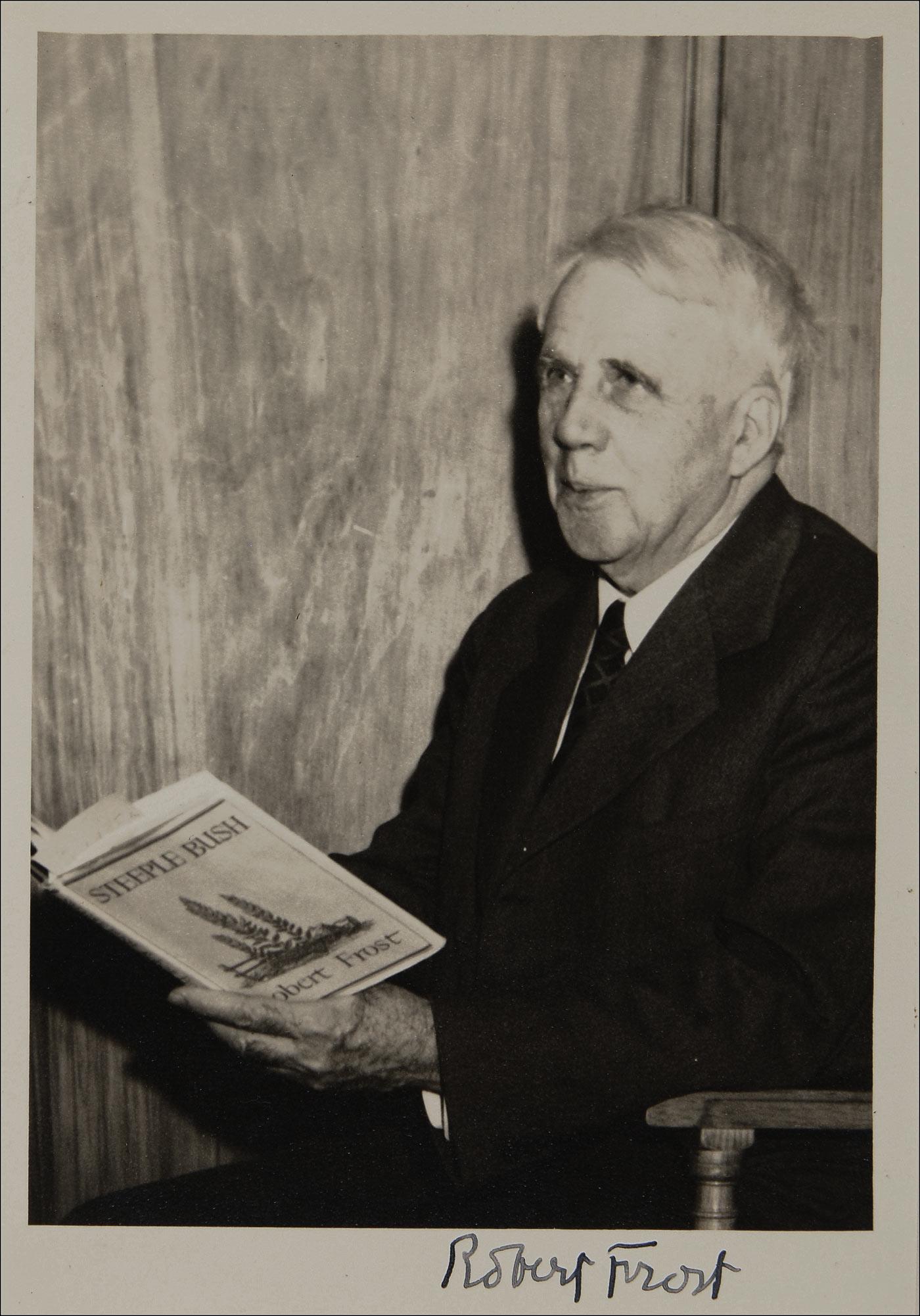 Vintage matte-finish 4.5 x 6.5 photo of Frost reading a copy of Steeple Bush, signed in the lower border in black ink. Matted to an overall size of 9 x 11. In fine condition, with light silvering to darker areas of lower portion of image.