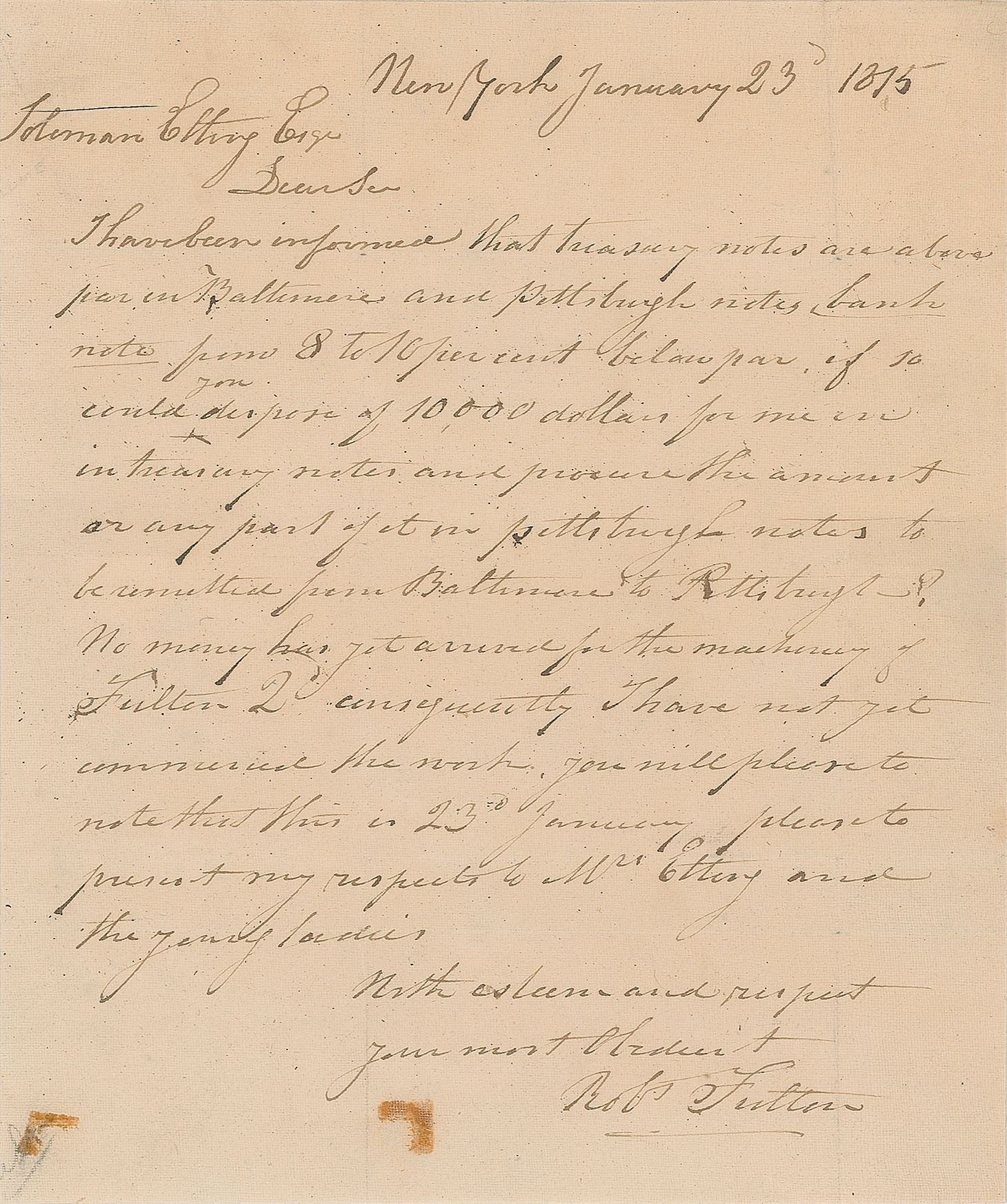 ALS signed “Rob't Fulton,” one page, 7.5 x 9, January 23, 1815. Letter to Baltimore merchant and politician Solomon Etting, in full: "I have been informed that treasury notes are above par in Baltimore and Pittsburgh notes, bank note from 8 to 10 percent below par, if so could you dispose of 10,000 dollars for me in treasury notes and procure the amount or any part of it in Pittsburgh notes to be remitted from Baltimore to Pittsburgh? No money has yet arrived for the machinery of Fulton & consequently I have not yet commenced the work. You will please to note that this is 23'd January, please to present my respects to Mrs. Etting and the young ladies." In fine condition, with two old tape stains to the lower blank area, and overall silking.