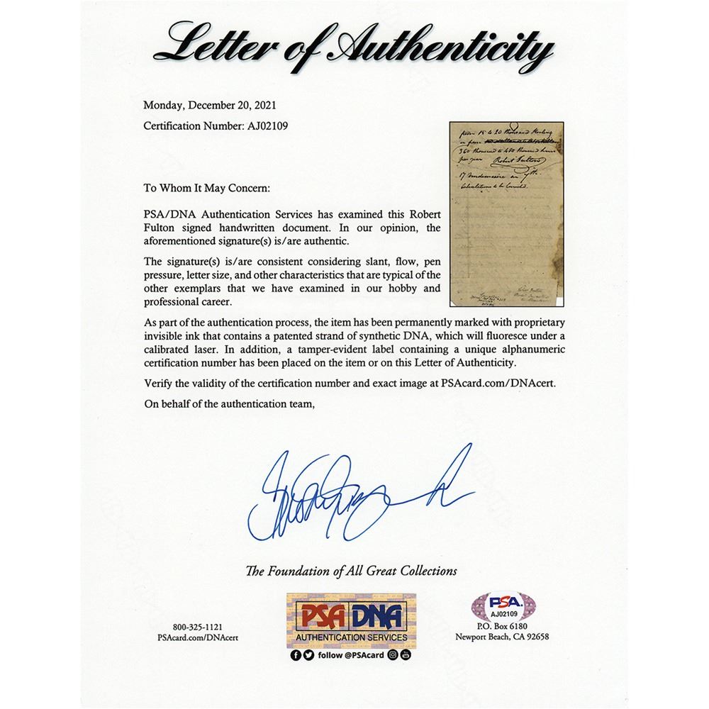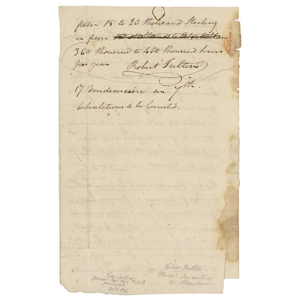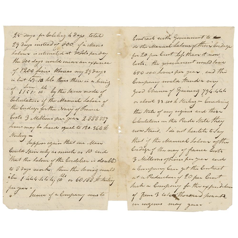 AMS signed "Robert Fulton," four pages on two adjoining sheets, 5 x 8.25, March 7, 1799. Handwritten manuscript headed "Comparative view of an engine and hand labour in making cables," estimating the amount of time and money saved by his technological innovations. In part: "Suppose by the spinning engine one man produces as much yarn as 20 this would reduce the work of spinning from 500 days to 25. 300 days labour seems to be allowed for laying the cable…In order to make the first rope of the able 4 men could certainly put the spools into the engine in one hour. As three such ropes are required, the labour would be 3 hours. The spools must then be put in the engine and the movements of the engine altered for cabling for this two hours are sufficient which together makes 5 hours work for 4 men but for contingencies estimate this at 4 days work. Hence the labour would stand thus; for spinning 25 days, for cabling 4 days, total 29 days instead of 300…the 300 days would incur an expense of 1200 Livres. Whereas my 29 days is but 49 Livres…By the same mode of calculations if the manual labour of the cordage for the Navy of France costs 3 millions per year, 2,333,3337 Livres may be saved." In very good to fine condition, with a small clipped off area, and associated slice to the bottom of the hinge. Accompanied by a full letter of authenticity from PSA/DNA.
