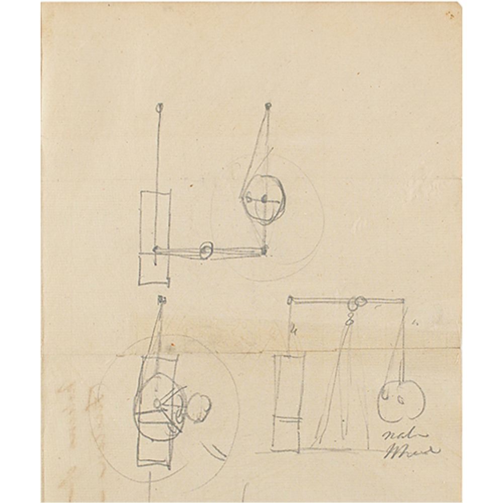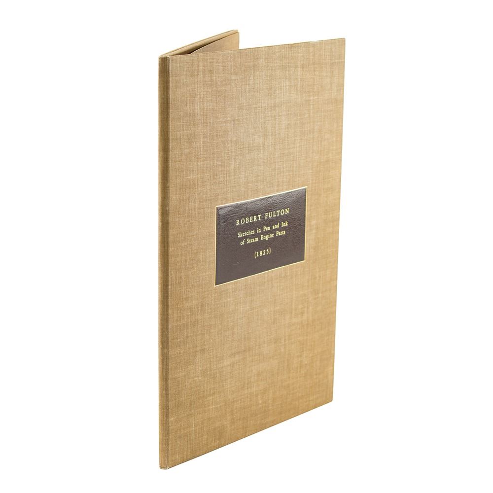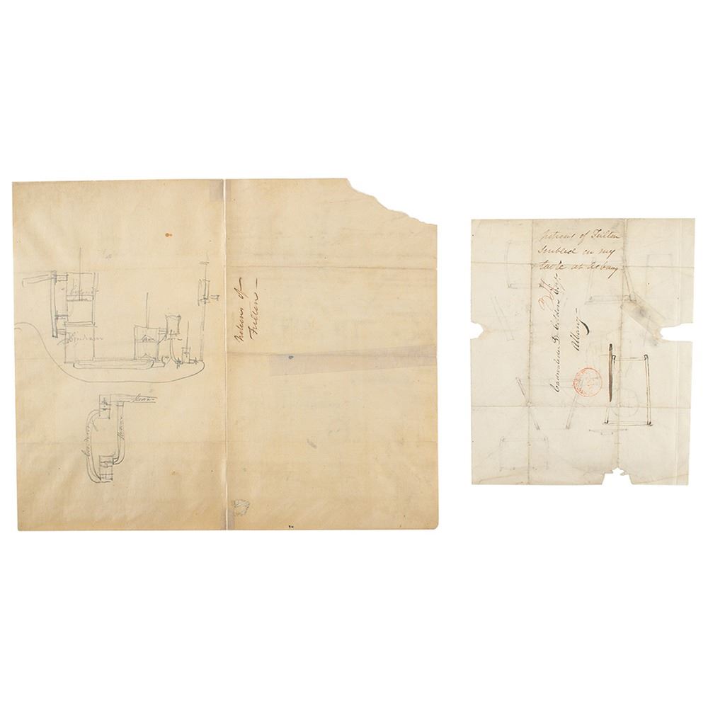 Extremely rare original drawings of steam engine parts by Robert Fulton, accomplished in ink and graphite on both sides of two off-white sheets, 9.75 x 8 and 15.75 x 13, unsigned and undated. The larger sheet features a series of six graphite sketches to front side, with Fulton adding ‰ÛÏWater Wheel‰Û to right side, and the reverse featuring a pair of drawings with Fulton identifying ‰ÛÏCylinder,‰Û ‰ÛÏCondenser,‰Û and ‰ÛÏAir Flow,‰Û to the upper drawing, and ‰ÛÏSteam‰Û and "Condensing‰Û to the lower; the adjacent side is annotated in another hand, ‰ÛÏPictures of Fulton.‰Û The smaller sheet, an unfolded mailing envelope, contains approximately nine ink drawings to front, with the reverse containing a single sketch; the mailing envelope is addressed to ‰ÛÏCadwaleder D. Colden, Esqr., Albany,‰Û and postmarked at New York, March 7, no year, with notations to right side: ‰ÛÏPictures of Fulton, Scribled on my table at Albany.‰Û In overall very good to fine condition, with professional overall silking to both items. Accompanied by a clothbound presentation folder.