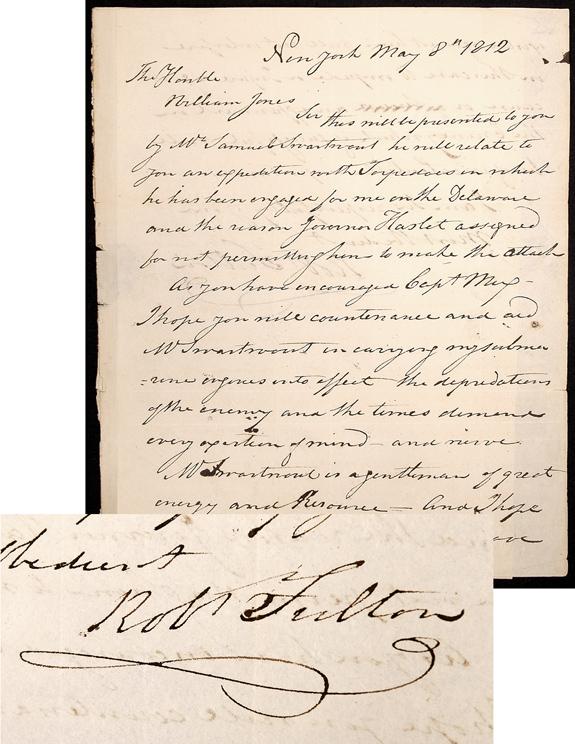 Robert Fulton War of 1812 ALS Urging Torpedo Warfare (1765-1815) American engineer, inventor, and artist. He invented a submarine but couldn't find a government interested in it. Robert R. Livingston commissioned him to build a steamboat and, after experimentaion, he built the first commercially successful steamboat. Autograph letter signed ("Robt Fulton"), 1½pp with integral address leaf, 9¾ x 8", New York, May 8, 1812 [actually 1813]. Fine condition. Written to Secretary of the Navy William Jones during the War of 1812, urging the support of torpedo warfare. "This will be presented to you by Mr. Samuel Swartwout. He will relate to you an expedition with torpedoes in which he has been engaged for me on the Delaware and the reason Governor Haslett assigned for not permitting him to make the attackā¦.I hope you will countenance and aid Mr. Swartwout in carrying my submarine engines into effect. The depredations of the enemy and the times demand every exertion of mind and nerve. Mr. Swartwout is a gentleman of great energy and resource. And I hope any Impression which may have existed against him will not interfere in this case to impede or injure a good cause or an experiment on the enemy which if successful will be of incalculable importanceā¦."