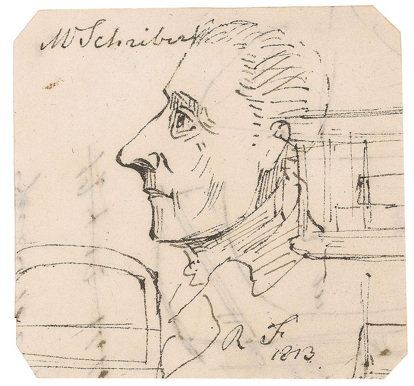 Original ink sketch of a side-facing view of a gentleman with surrounding mechanical diagrams accomplished by Fulton on an off-white 2.5 x 2.5 clipped sheet, titled at the top, “M. Schriber,” and signed with his initials below, “R. F., 1813.” In fine condition. Though perhaps best known for his invention of the steamboat, Fulton also developed and designed naval weaponry for several nations—namely France, England, and America—thus making him quite adept at drawing and sketching. As an original sketch from the hand of an globally influential inventor, this is a truly remarkable piece.