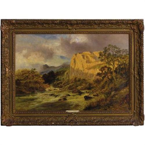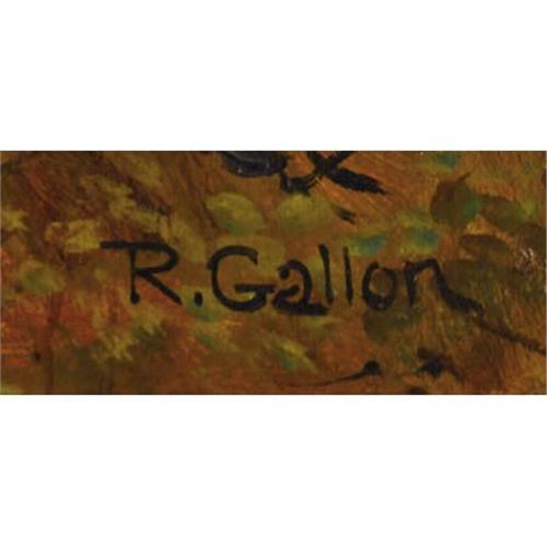 <B>ROBERT GALLON (British, 1845-1925)</B></I><BR><I>Landscape</B></I>, circa 19th Century<BR>Oil on canvas laid on board<BR>20 x 30 inches (50.8 x 76.2 cm)<BR>Signed lower right: <I>R. Gallon</B></I><BR> <B>Condition Report:</B> Canvas has been reinforced with board for support. Surface dirt; quarter-inch indentation in lower right corner; minor scattered strengthening; One and one-half-inch long stain in upper center of the sky.<BR><BR><b>Shipping:</b> Framed - without Glass, Medium (<a target="_blank" href="http://www.heritageauctions.com/common/shipping.php">view shipping information</a>)