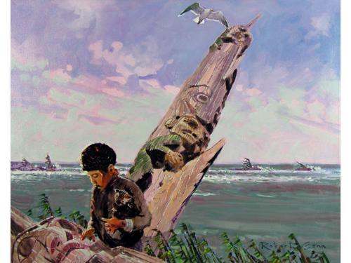 [Canadian FCA b. 1936] THE OLD K'SAN POLE AND PETER OWL; 1973 Oil on canvas 24 x 30 ins. Signed, titled & dated Provenance: Hambleton Galleries, Kelowna