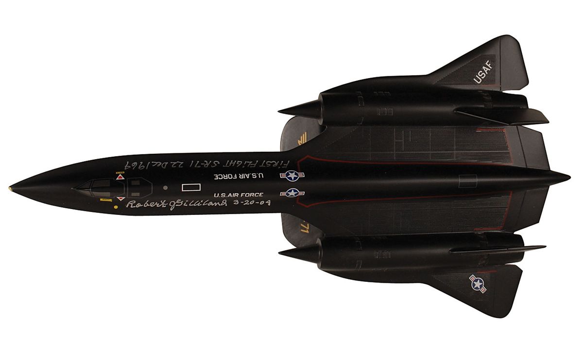 Test pilot who has logged more experimental supersonic flight test time above Mach 2 and Mach 3 than any other pilot. Scale model (1/72) of the SR-71 Blackbird signed in silver ink on the left side “Robert J. Gilliland 3-20-04” adding on the right side “First Flight SR-71 22 Dec ‘64.” In very fine condition. Accompanied by a color 11 x 8.5 laser print image of him in front of the plane with a printed signature inherent to the original photo.