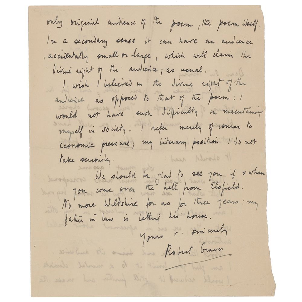 ALS, one page both sides, 6.5 x 8, 1927. Letter to Sir Henry Newbolt, in part: "Many thanks for your letter, and for the return of the proofs. Your second choice pleases me much better. You will have noticed a lacuna in Alice in the proofs. It should read: why must I assume That what I'd see them must needs correspond With what I see now? And the rooms beyond I am gratified by your interest in my other work. Yes, we are in agreement about ballad authorship. About the poem and its audience. I am glad you limit it to a mental climate: I would reduce it still further and make the only original audience of the poem, the poem itself. In a secondary sense it can have an audience accidentally small or large, which still claims the divine right of the audience as opposed to that of the poem: I would not have such difficulty in maintaining myself in society. I refer merely of course to economic pressure; my literary position I do not take seriously. We should be glad to see you if & when you come over the hill from Elsfield. No more Wiltshire for us for three years: my father in law is letting us his house." In fine condition.