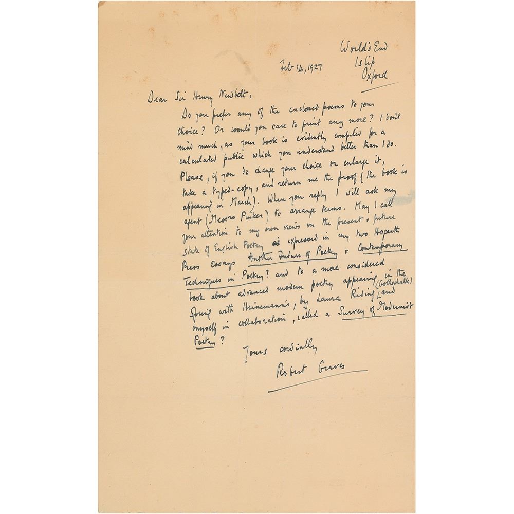 ALS, one page, 8 x 13, February 14, 1927. Handwritten letter from the 32-year-old to fellow poet Henry Newbolt. In part: "Do you prefer any of the enclosed poems to your choice? Or would you care to print any more? I don't mind much, as your book is evidently compiled for a calculated public which you understand better than I do…May I call your attention to my own views on the present & future state of English Poetry as expressed in my two Hogarth Press essays Another Future of Poetry & Contemporary Techniques in Poetry?" In fine condition, with some very staining along the top. The book to which Graves refers, which he co-authored with Laura Riding Jackson, was entitled A Survey of Modernist Poetry, published by W. Heinemann Ltd. in 1927. An extremely early ALS by a major English poet and a major influence on 20th-century Modernist poetry.
