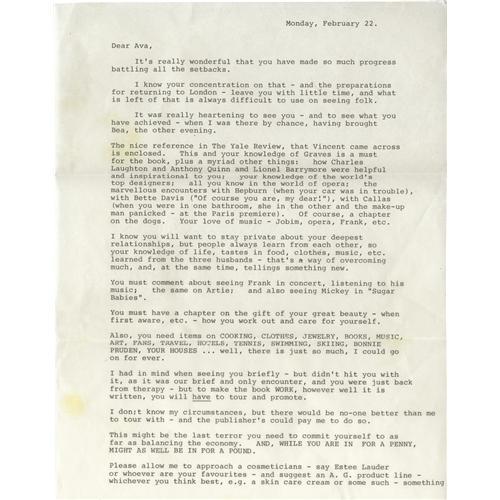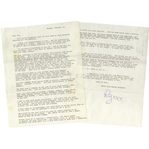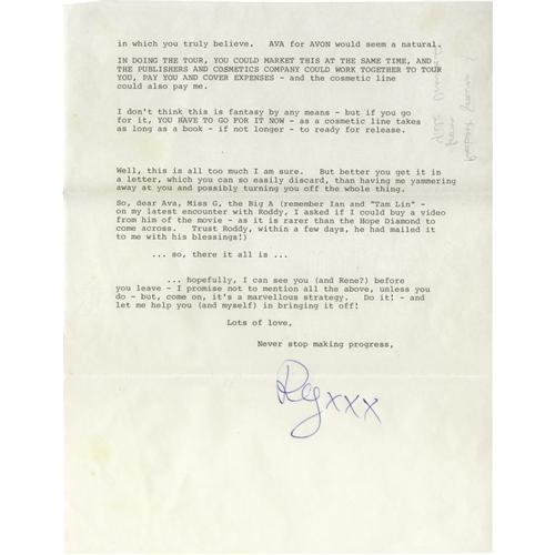 <B>Correspondence to Ava Gardner.</B></I> This letter dated February 22 (no year) encourages Ava to write her memoirs, mentions the many famous people in her life ("Frank," "Mickey," "Artie," etc.), her inspirations (Charles Laughton, Anthony Quinn, Lionel Barrymore), her love of dogs, music, jewelry, sports, etc. Signed in blue ink, "Reg xxx." The letter also exhorts her to promote a cosmetology line ("AVA for AVON would seem a natural") and offers to help her market her name and tour with her to promote both the book and the cosmetics. This lot also incudes a photocopy of a poem Robert Graves has written entitled "The Portrait", which was presumably inspired by Ava ("She is wild and innocent, pledged to love through all disaster..."). This provides a vivid insight into the devotion Ava Gardener inspired in all variety of men, including a noted scholar who wrote <I>Claudius.</B></I> Excellent condition. <I>From the Ava Gardner Estate.</B></I><BR><BR><b>Shipping:</b> Other (oversized items, group lo (<a target="_blank" href="http://www.heritageauctions.com/common/shipping.php">view shipping information</a>)