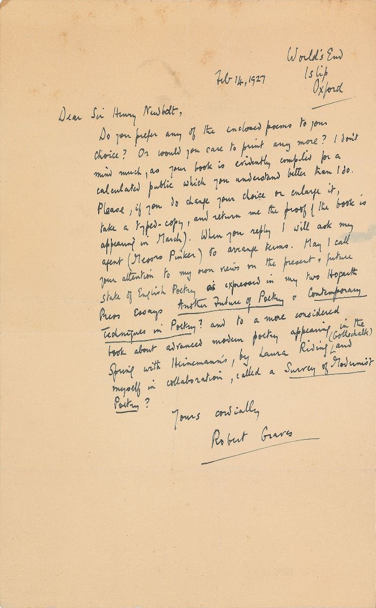English poet, translator, and novelist (1895–1985). ALS, one page, 8 x 13, February 14, 1927. Letter to fellow poet Henry Newbolt. In part: “Do you prefer any of the enclosed poems to your choice? Or would you care to print any more? I don’t mind much, as your book is evidently compiled for a calculated public which you understand better than I do…May I call your attention to my own views on the present & future state of English Poetry as expressed in my two Hogarth Press essays Another Future of Poetry & Contemporary Techniques in Poetry?” In fine condition, with some very staining along the top.