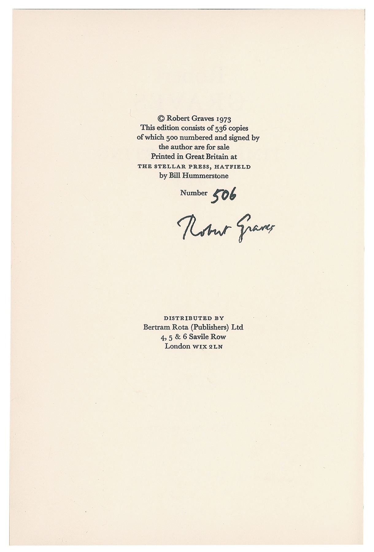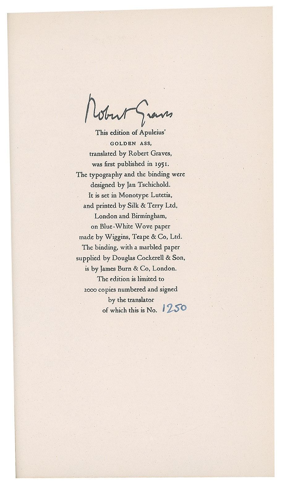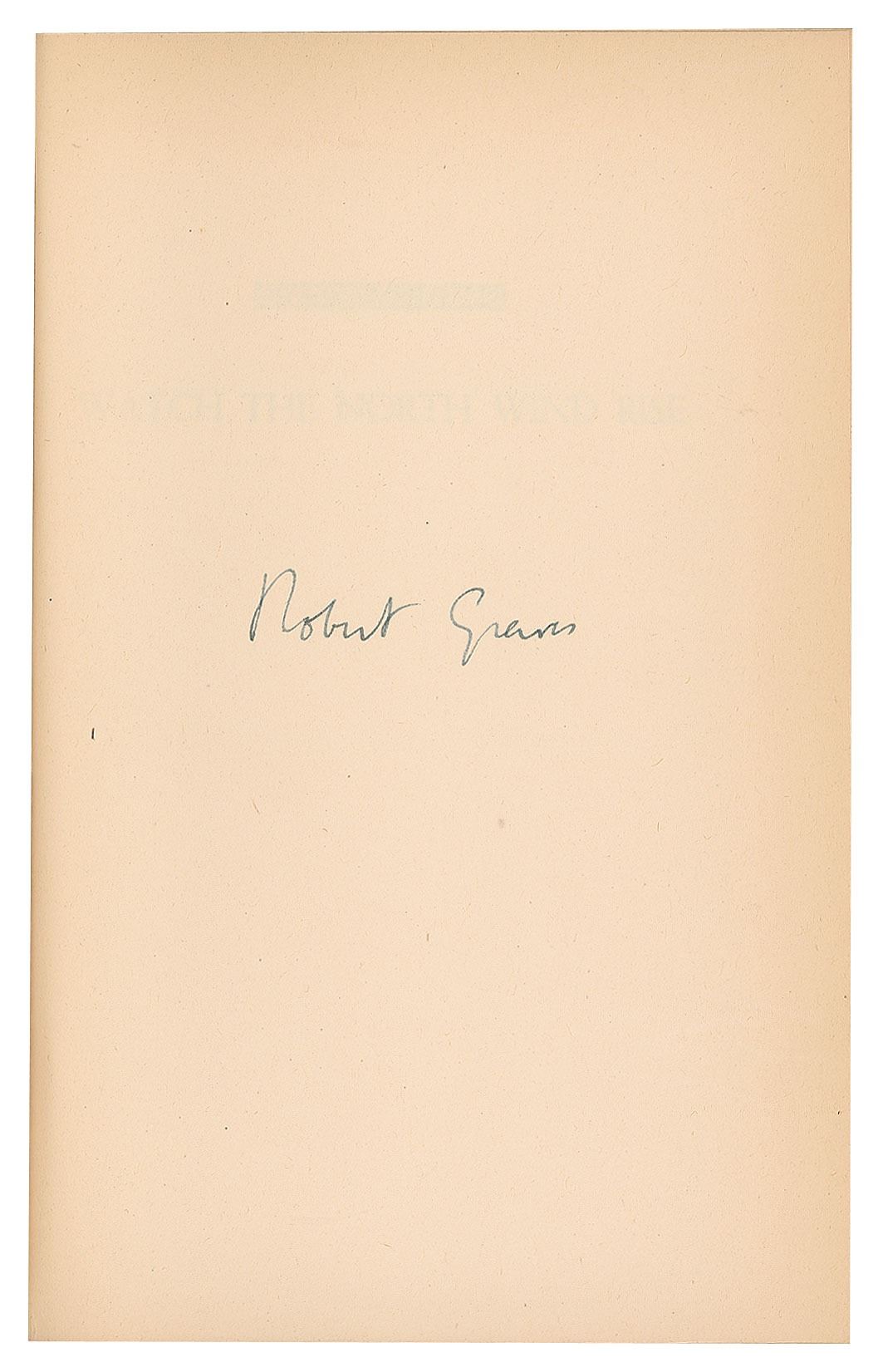 Three books signed by Graves: a slipcased limited edition of his translation of The Golden Ass by Lucius Apuleius, numbered 1250/2000, signed on the colophon in fountain pen; a first edition of Watch the Northwind Rise, hardcover with dust jacket, signed on a free end page in fountain pen; and a limited edition of Timeless Meeting, numbered 506/536, signed on the colophon in fountain pen. In overall fine condition, with some wear and toning to The Golden Ass slipcase. Accompanied by a custom-made half morocco case for the Timeless Meeting book, which is bumped on the top edge.