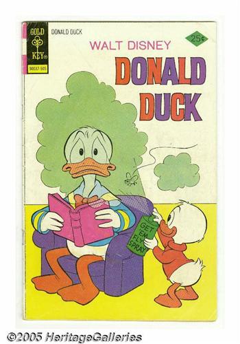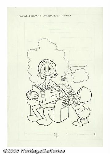 <B>Robert Gregory - Donald Duck #163 Cover Original Art (Gold Key, 1975).</B></I> This in-your-face illustration of Uncle Donald and his nephew was used as the cover for <B>Donald Duck</B></I> #163, which was published by Gold Key in 1975. Exceptionally nice, clean inking is the hallmark of this noxious narrative. The image area measures 10" x 15" and the work is in Excellent condition. Includes a copy of <B>Donald Duck</B></I> #163.