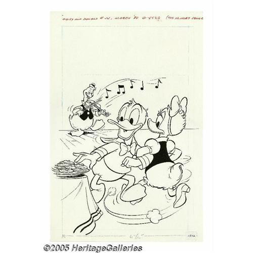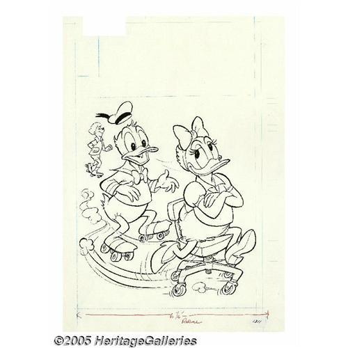 <B>Robert Gregory (attributed) - Daisy and Donald Cover Original Art, Group of 3 (Gold Key, 1980).</B></I> Daisy and her main squeeze, Donald Duck, waddle onto the main stage of these three cover illustrations. These covers appeared on " "<B>Daisy and Donald</B></I> #44 (special cameo by Gus Goose), 45, and 46. The image area of each cover measures 10"" x 12"", and the art is in Excellent condition. <I>From the Random House Archives</B></I>. <BR><BR><B>Important notice:</B> Heritage usually auctions material at the rate of 200-250 lots per hour. On some occasions eBay Live bid software or the Internet may not be able to keep up with the pace of the auction. We recommend placing a realistic absentee bid now as insurance to avoid disappointment. Occasionally the auctioneer may eliminate or reject an eBay Live bid, and the auctioneer may also reopen a lot after the close of the eBay live bidding (usually because we missed an audience bid), and may reject your bid even if it shows you as the winning bidder. By bidding via eBay Live, you agree that Heritage may award the lot to another bidder at its sole discretion under the circumstances described above or any other reasonable circumstances. Since eBay bids are not shown to us until we open the lot on the floor, we treat those bids just like floor bids. In most cases the floor responds before the eBay bid is presented to us, due to Internet lag time, so for consistency we have made it a policy that floor bids are always considered first over tie eBay live bids. Also please note that all Heritage lots purchased through eBay Live carry a 20% Buyer's Premium. Please make sure you read the Terms and Conditions before you bid. This lot is being auctioned in conjunction with a live floor auction by Heritage Galleries & Auctioneers. All final auction and invoice information will be supplied by Heritage Galleries & Auctioneers, and all other information should be considered preliminary. Lot:3215 <BR><BR><B>Winning Notification