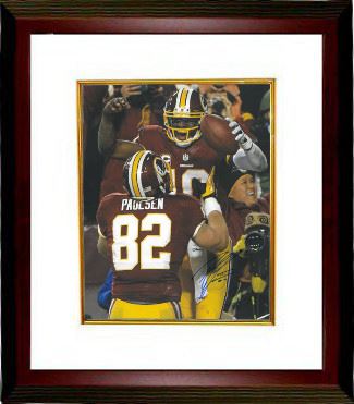 Robert Griffin III, nicknamed RG3, played college football for the Baylor Bears, and won the 2011 Heisman Trophy. He was selected by the Redskins with the second pick of the 2012 NFL Draft. On September 9, 2012, Griffin officially became the NFL's first starting quarterback who was born in the 1990s. In his official debut as a starting quarterback in the NFL, Griffin opened the Redskins' season by completing 19 of 26 passes for 320 yards and 2 touchdowns while adding 10 carries for 42 rushing yards in a 40-32 victory over the New Orleans Saints. He was named NFC Offensive Player of the Week for his performance- the first time in NFL history that a rookie quarterback has been given that honor for his debut game. On December 26, Griffin was named to enter the 2013 Pro Bowl. Due to injuries on his ACL and LCL ligaments in his right knee, he was negated from the Pro Bowl roster and replaced by Drew Brees. Robert Griffin III has hand signed this Washington Redskins 16x20. Certificate of Authenticity from Athlon Sports. Custom White Mat and Premium Mahogany Color Framed as shown.