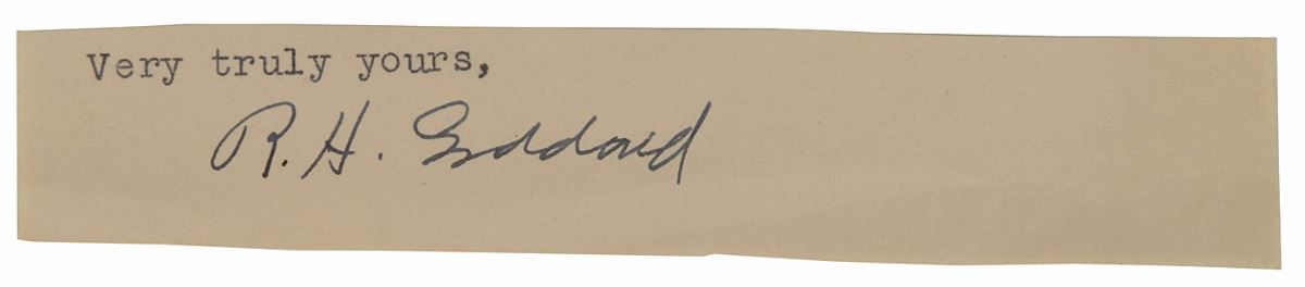 Rare ink signature, "R. H. Goddard,” on an off-white 5 x 1 slip. Also includes material from the collection of Goddard rocket team member and machinist Nils Thure Ljungquist, including his selective service classification card, a copy of a methane pump design drawing signed by Ljungquist, reproduced photos of Goddard's machine shop, a modern postcard of Godddard with his early rocket, and a press release with information on a Goddard exhibit. In very good to fine condition. Accompanied by a TLS by Esther C. Goddard. From the collection of aerospace memorabilia specialist Ken Havekotte. Pre-certified Zarelli Space Authentication.