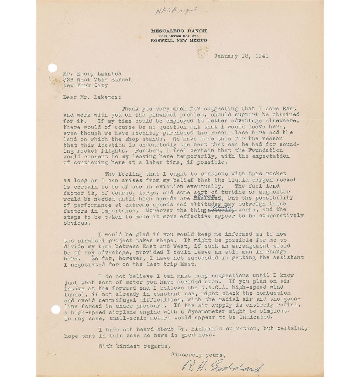 TLS signed “R. H. Goddard,” one page, 8.5 x 11, Mescalero Ranch, Roswell, New Mexico letterhead, January 18, 1941. Letter to Emory Lakatos. In full: “Thank you very much for suggesting that I come east and work on the pinwheel problem, should support be obtained for it. If my time could be employed to better advantage elsewhere, there would of course be no question but that I would leave here, even though we have recently purchased the ranch place here and the land on which the shop stands. We have done this for the reason that this location is undoubtedly the best that can be had for sounding rocket flights. Further, I feel that the Foundation would consent to my leaving here temporarily, with the expectation of continuing here at a later time, if possible. The feeling that I ought to continue with this rocket as long as I can arises from my belief that the liquid oxygen rocket is certain to be of use in aviation eventually. The fuel load factor is, of course, large, and some sort of turbine or augmentor would be needed until high speeds are attained, but the possibility of performance at extreme speeds and altitudes may outweigh these factors in importance. Moreover the thing already works, and the steps to be taken to make it more effective appear to be comparatively obvious. I would be glad if you would keep me informed as to how the pinwheel project takes shape. It might be possible for me to divide my time between East and West, if such an arrangement would be of any advantage, provided I could leave an able man in charge here. So far, however, I have not succeeded in getting the assistant I negotiated for on the last trip East. I do not believe I can make any suggestions until I know just what sort of motor you have decided upon. If you plan on air intake at the forward end I believe the N. A. C. A. high-speed wind tunnel, if not already in constant use, might check the combustion and avoid centrifugal difficulties, with the radial air and the gasoline forced in under pressure. If the air supply is entirely radial, a high-speed airplane engine with a dynamometer might be simplest. In any case, small-scale motors would appear to be indicated. I have not heard about Dr. Hickman’s operation, but certainly hope that in this case no news is good news.” Two words, “attained” and “already,” were added as corrections in Goddard’s hand. In fine condition, with punch holes to the left border and some soiling to the upper portion of the letter, far from the main text and signature, affecting nothing.