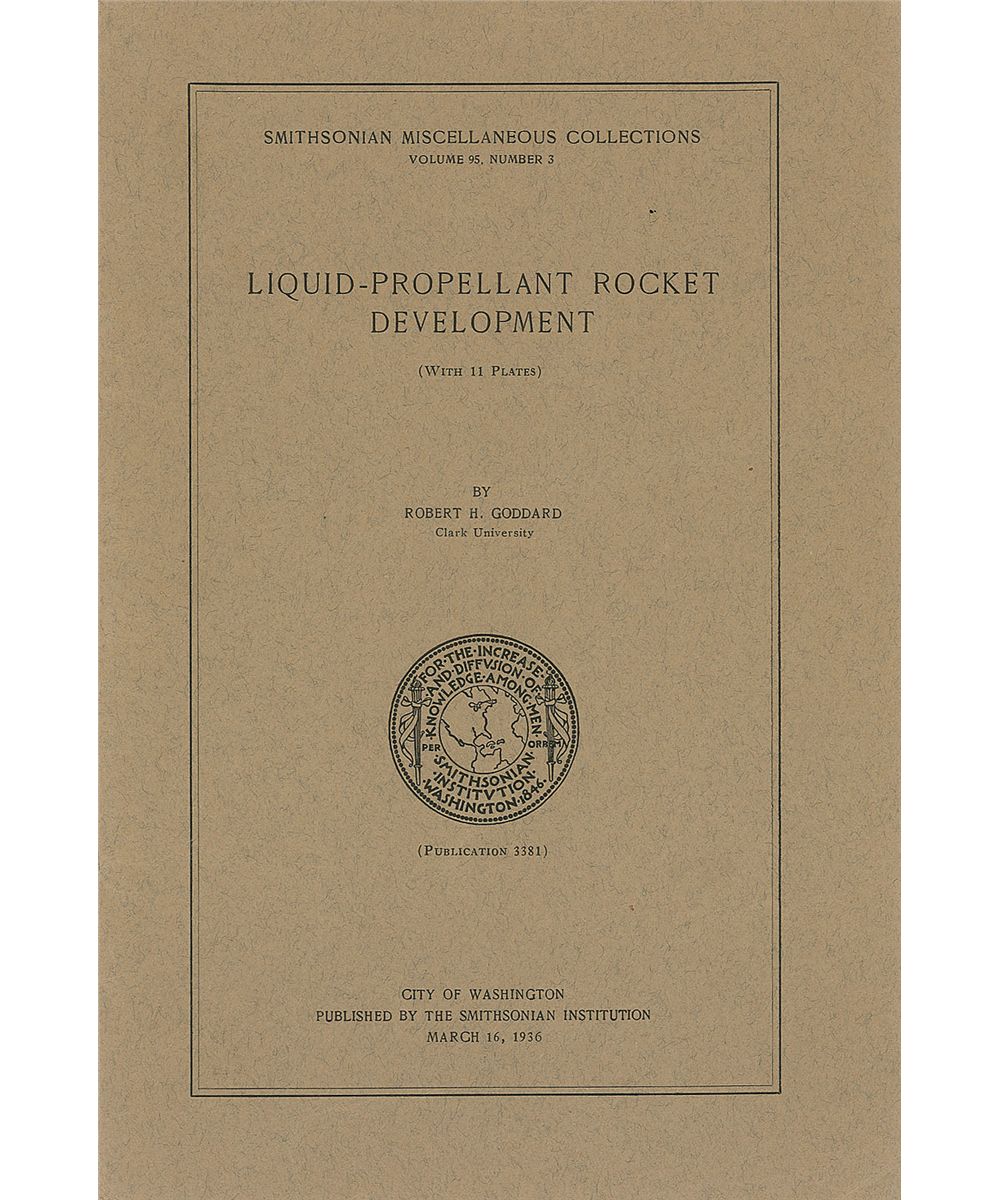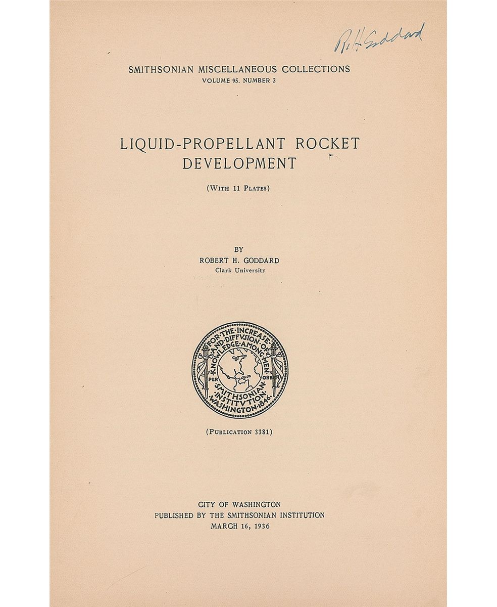 Booklet, 6.5 x 9.5, 14 pages, of an article by Goddard entitled “Liquid-Propellant Rocket Development,” published by the Smithsonian Institute on March 19, 1936. Signed in fountain pen on the first inside page, “R. H. Goddard.” In fine condition. This article featured a report on Goddard’s results on various experiments with rocket propulsion, including his first successful test of the first rocket powered by liquid fuel. Many of these experiments were possible through the support of Charles Lindbergh and the Guggenheim Foundation. Goddard is quite scarce in any form, particularly with direct relation to his work.