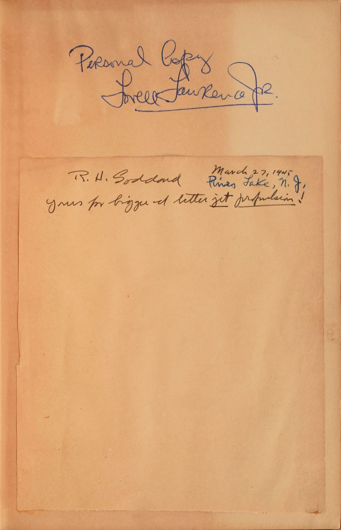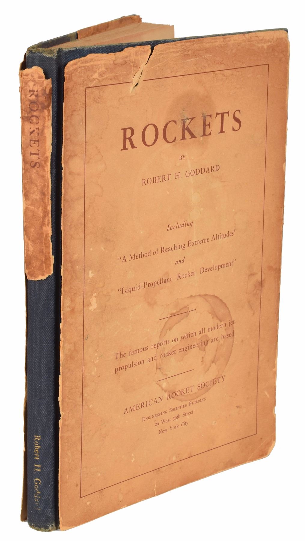 Physicist and inventor (1882–1945) credited with creating and building the world's first liquid-fueled rocket. Fountain pen signature, "R. H. Goddard, yours for bigger and better jet propulsion!,” on an off-white 5.25 x 6 sheet, dated March 27, 1945, at Pines Lake, New Jersey. The sheet is affixed to the first free end page of the scarce 1946 edition of Rockets by Robert H. Goddard published by the American Rocket Society. Autographic condition: very good to fine, with light overall rippling and toning. Book condition: G+/Poor, with heavy staining, splits, and paper loss to dust jacket.