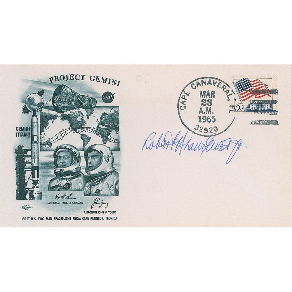 First African-American astronaut (1935–1967) who was killed in a crash of an F-104 Starfighter at Edwards Air Force Base. Scarce commemorative cover with a cachet honoring Project Gemini, signed in blue ballpoint, "Robert H. Lawrence, Jr." In fine condition.