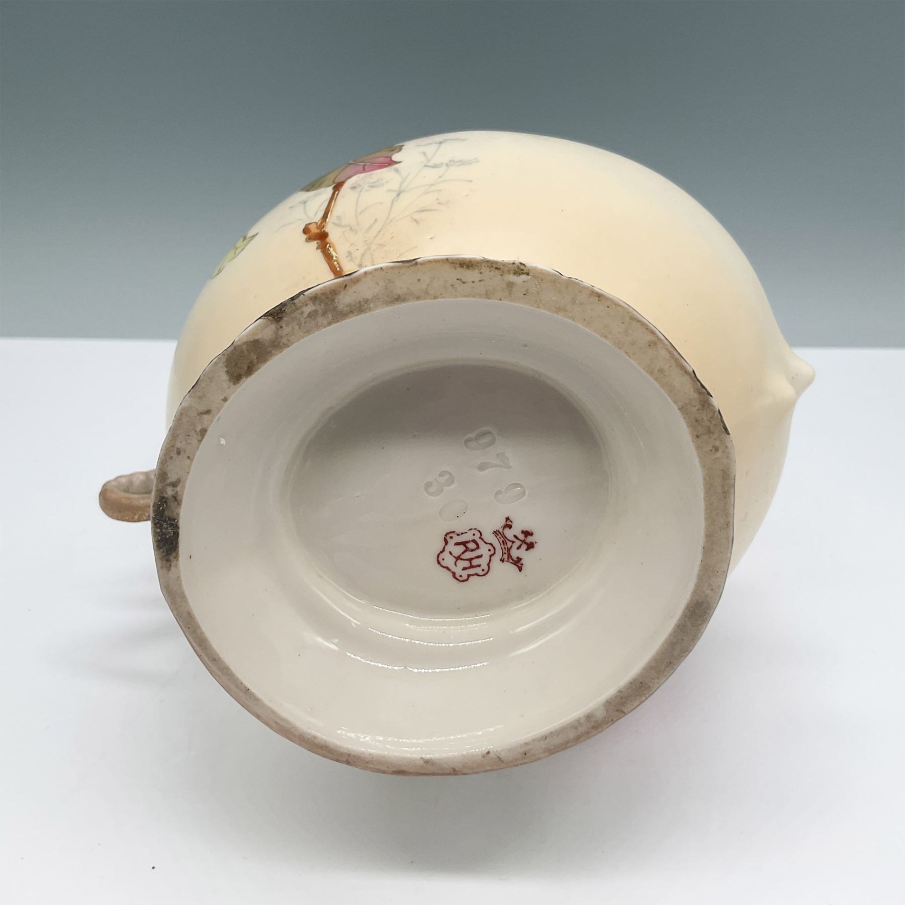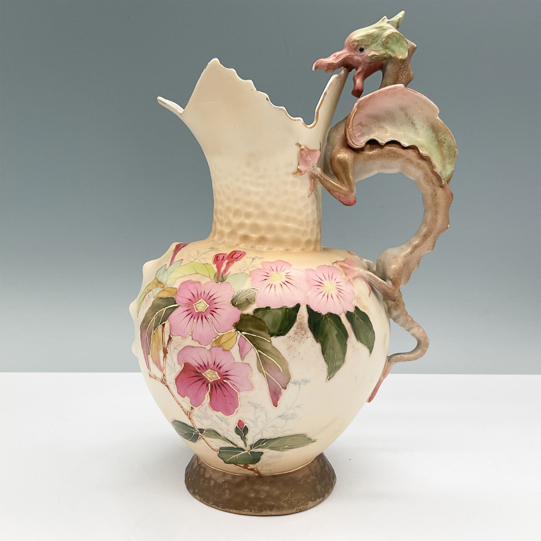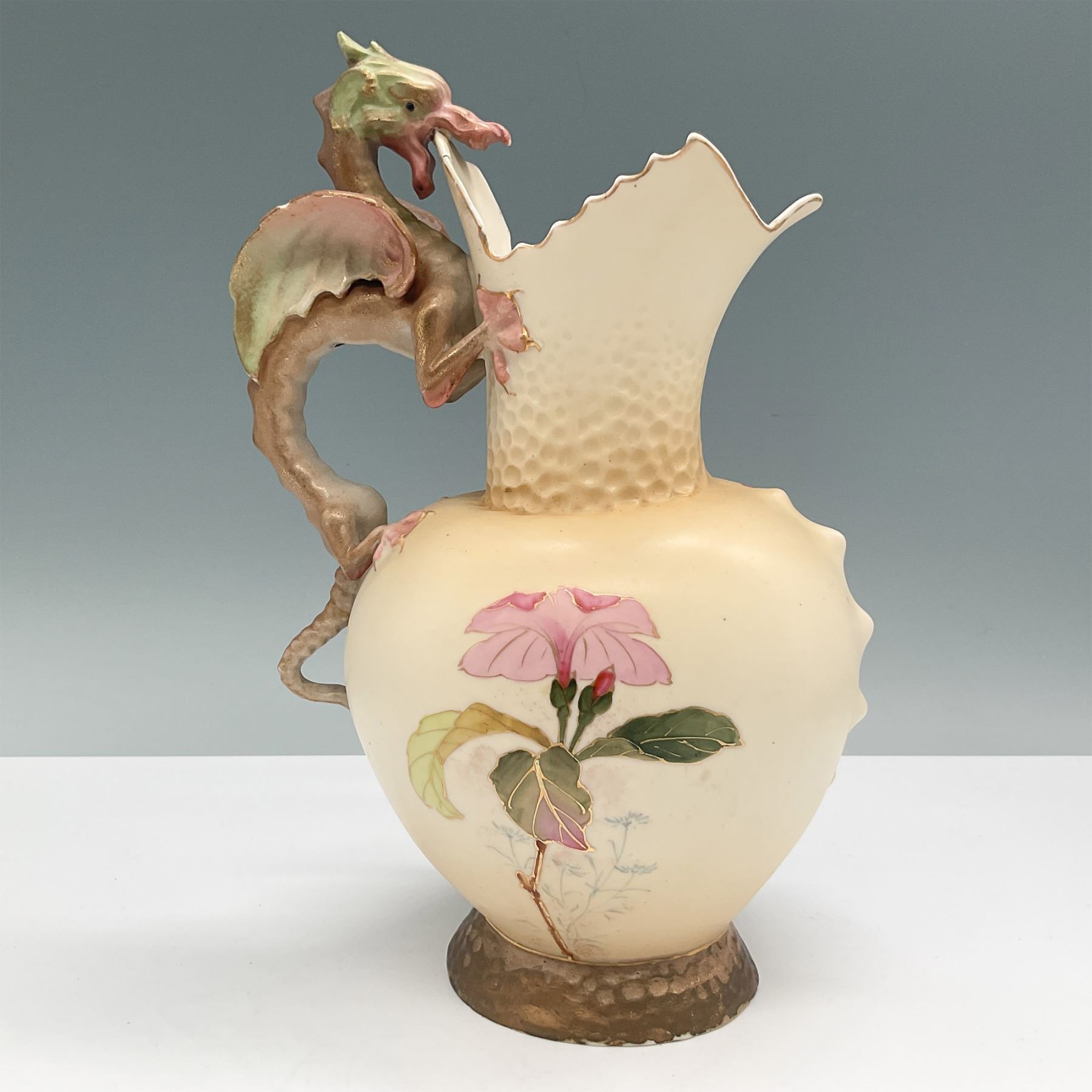 A vintage hand-painted china pitcher featuring a distinctive dragon handle design. The body is adorned with delicate floral motifs in shades of pink and green, accented with gold detailing. The textured spout and organic shape complement the artistic theme. Marked with a brown backstamp on the base. Measures approximately 9.75"H. This unique piece combines functionality with artistic craftsmanship, making it a standout addition to any collection.