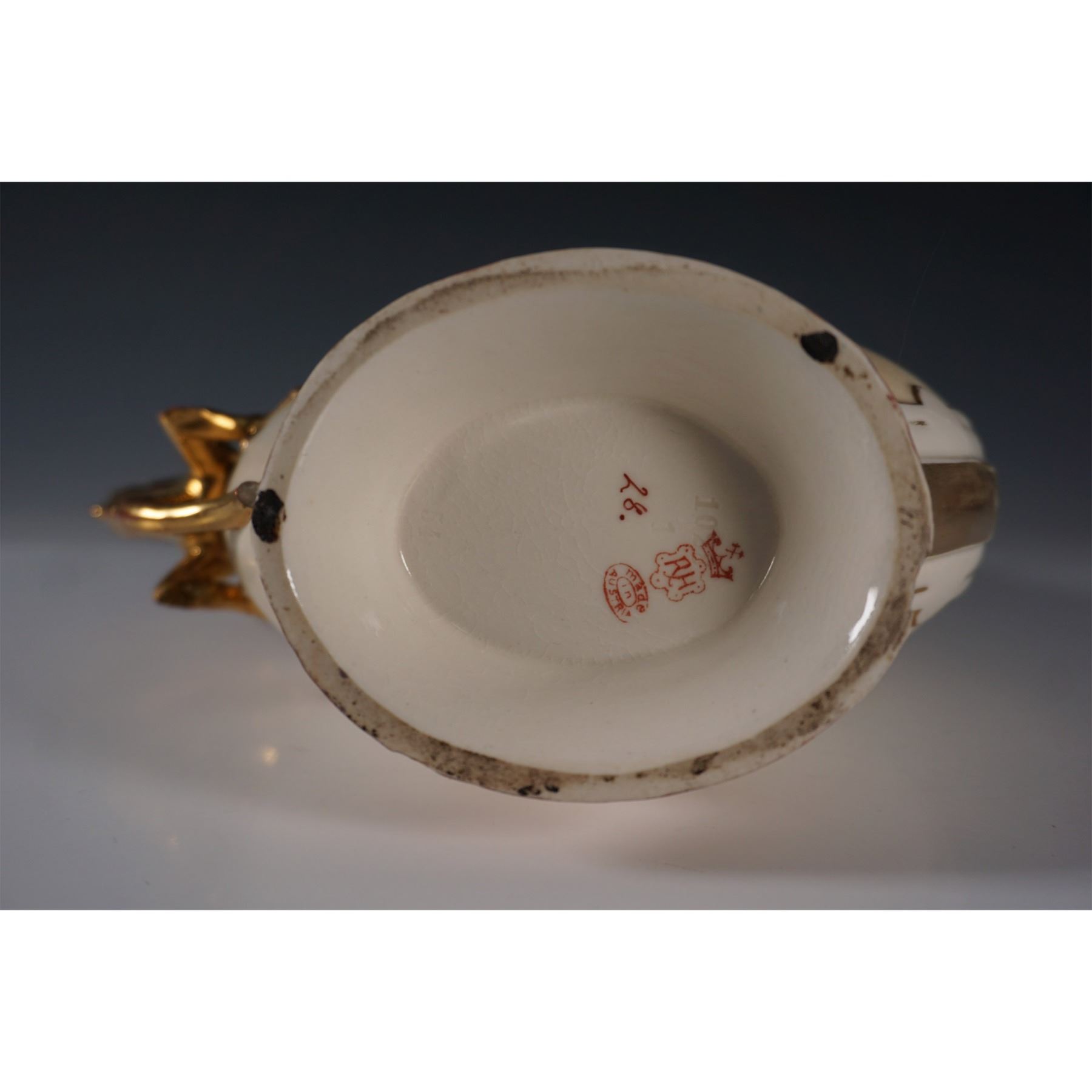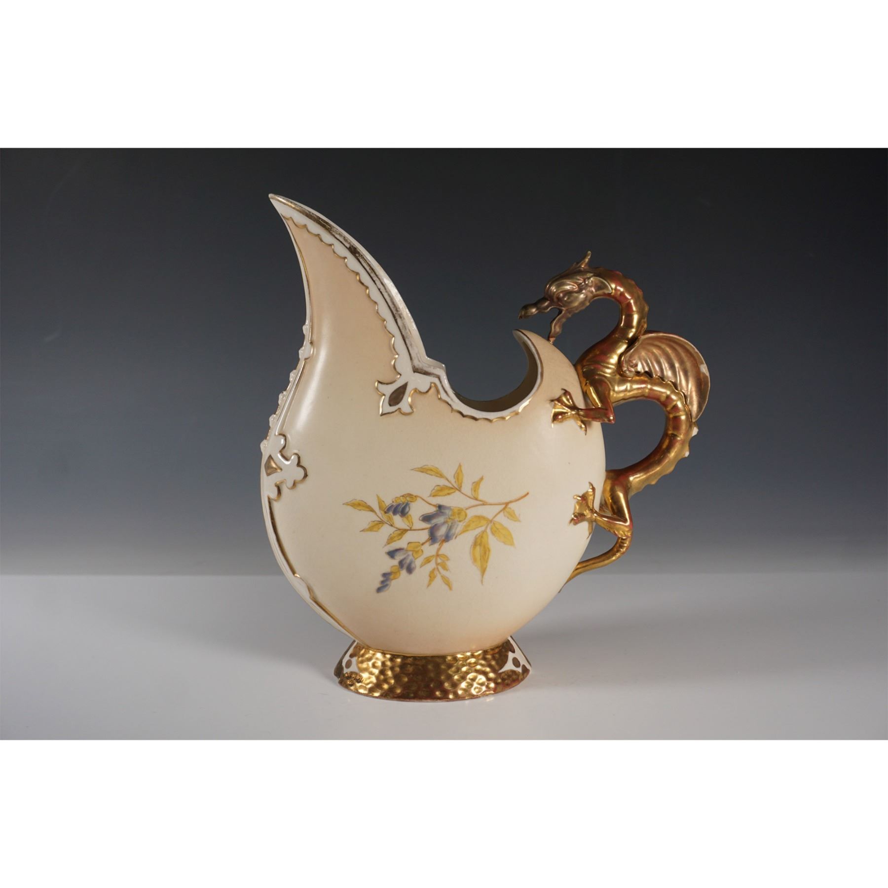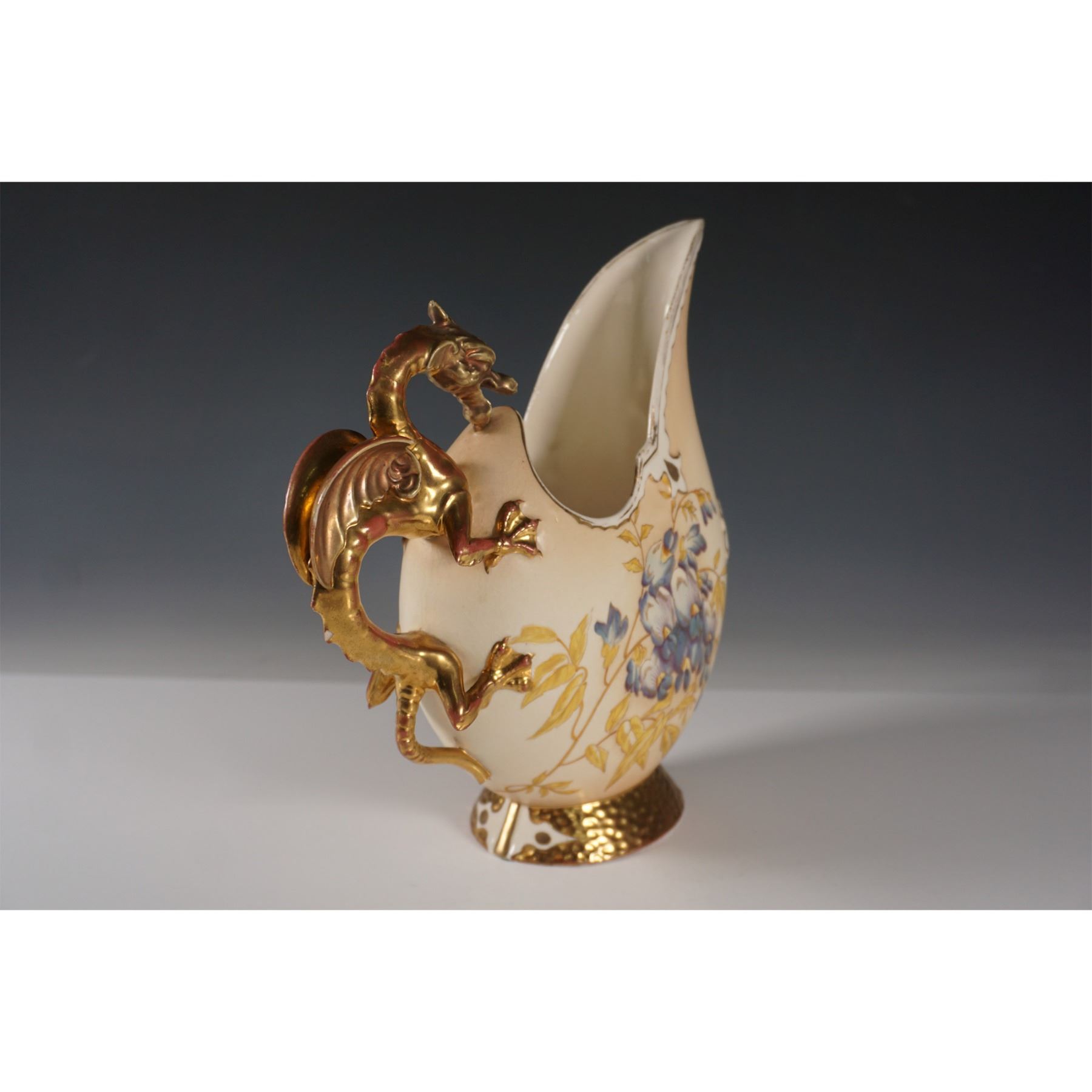 Elegant Robert Hanke porcelain pitcher featuring a dramatic dragon-form handle with rich gilt accents. The body is adorned with hand-painted floral motifs in delicate blue and gold hues, complemented by intricate raised detailing along the rim. The base showcases additional gilt highlights. Marked on the underside with the Robert Hanke porcelain factory backstamp. A striking example of late 19th to early 20th-century European craftsmanship.