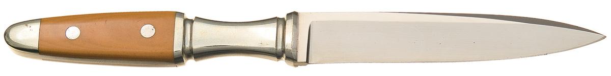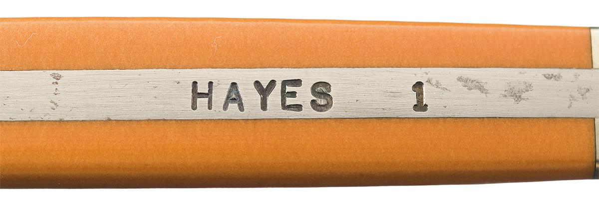 This knife was handcrafted by Robert Hayes. The knife has a 4 1/4 inch long blade. The tang is marked "HAYES 1". Consignor notes state that this knife is an early Hayes prototype. Silver front and rear bolsters with micarta scales. OAL: 8 1/4".