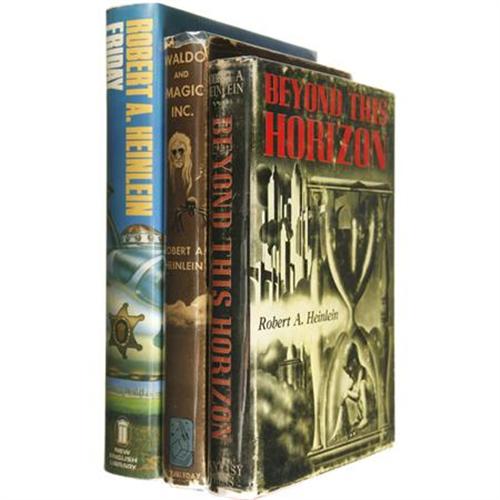 <B>Robert Heinlein: Lot of Three Books.</B></I> Includes the following:<BR><B><I>Beyond This Horizon.</B></I></B></I> (Reading, PA: Fantasy Press, 1948), first edition, 242 pages, orange boards, 8vo, dust jacket. Condition (book/ dj): very good/ very good.<BR><B><I>Waldo and Magic, Inc..</B></I></B></I> (New York: Doubleday & Company, Inc., 1951), later printing, 219 pages, blue boards, 8vo, dust jacket. Condition (book/ dj): very good/ good.<BR><B><I>Friday.</B></I></B></I> (London: New English Library, 1982), first English edition, 380 pages, blue boards, 8vo, dust jacket. Condition (book/ dj): fine/ fine.<BR><BR><b>Shipping:</b> Books & Catalogs (<a target="_blank" href="http://www.heritageauctions.com/common/shipping.php">view shipping information</a>)