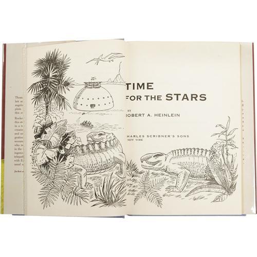 <B>Robert A. Heinlein: <I>Time for the Stars</B></I>.</B></I> (New York: Scribner's Sons, 1956), first edition, first printing ("A-8.56 v " appears on the copyright page), 244 pages, blue cloth with black lettering on spine and decorative stamping on the front cover, 8vo (5.5" x 8.25"), first issue $2.75 dust jacket (in protective Mylar). Jacket and title page illustrated by Clifford Geary. The tenth installment in Heinlein's juvenile series published at Scribner's between 1947 and 1958. The copy presented here is fine, with very minimal wear to the edges of the dust jacket. Textblock is in virtually unread condition. An essential volume in Heinlein's juvenile series in excellent condition. <I>From the Ventura Collection.</B></I><BR><BR><b>Shipping:</b> Books & Catalogs (<a target="_blank" href="http://www.heritageauctions.com/common/shipping.php">view shipping information</a>)