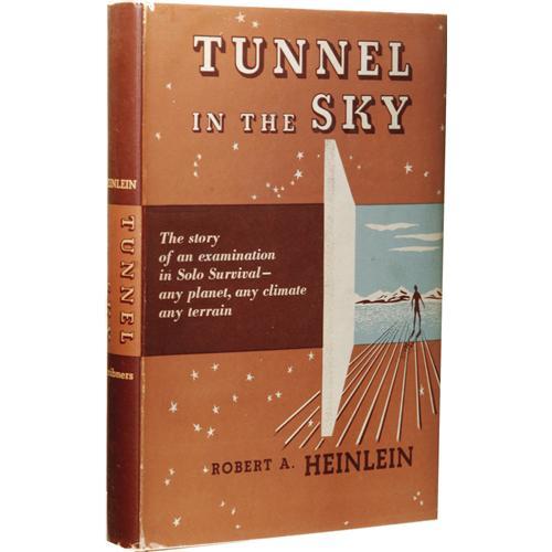 <B>Robert A. Heinlein: <I>Tunnel in the Sky</B></I>.</B></I> (New York: Scribner's Sons, 1955), first edition, first printing ("A" on title page), 273 pages, light brown cloth with brown lettering on spine and decorative stamping on front board, 8vo (5.5" x 8.25"), first issue $2.50 dust jacket (in protective Mylar). Jacket and title page illustrated by P.A. Hutchison. The ninth installment in Heinlein's juvenile series published at Scribner's between 1947 and 1958. The copy presented here is fine, with very minimal wear to the edges of the dust jacket. Textblock is in virtually unread condition. A real treat for any Heinlein collector. <I>From the Ventura Collection.</B></I><BR><BR><b>Shipping:</b> Books & Catalogs (<a target="_blank" href="http://www.heritageauctions.com/common/shipping.php">view shipping information</a>)