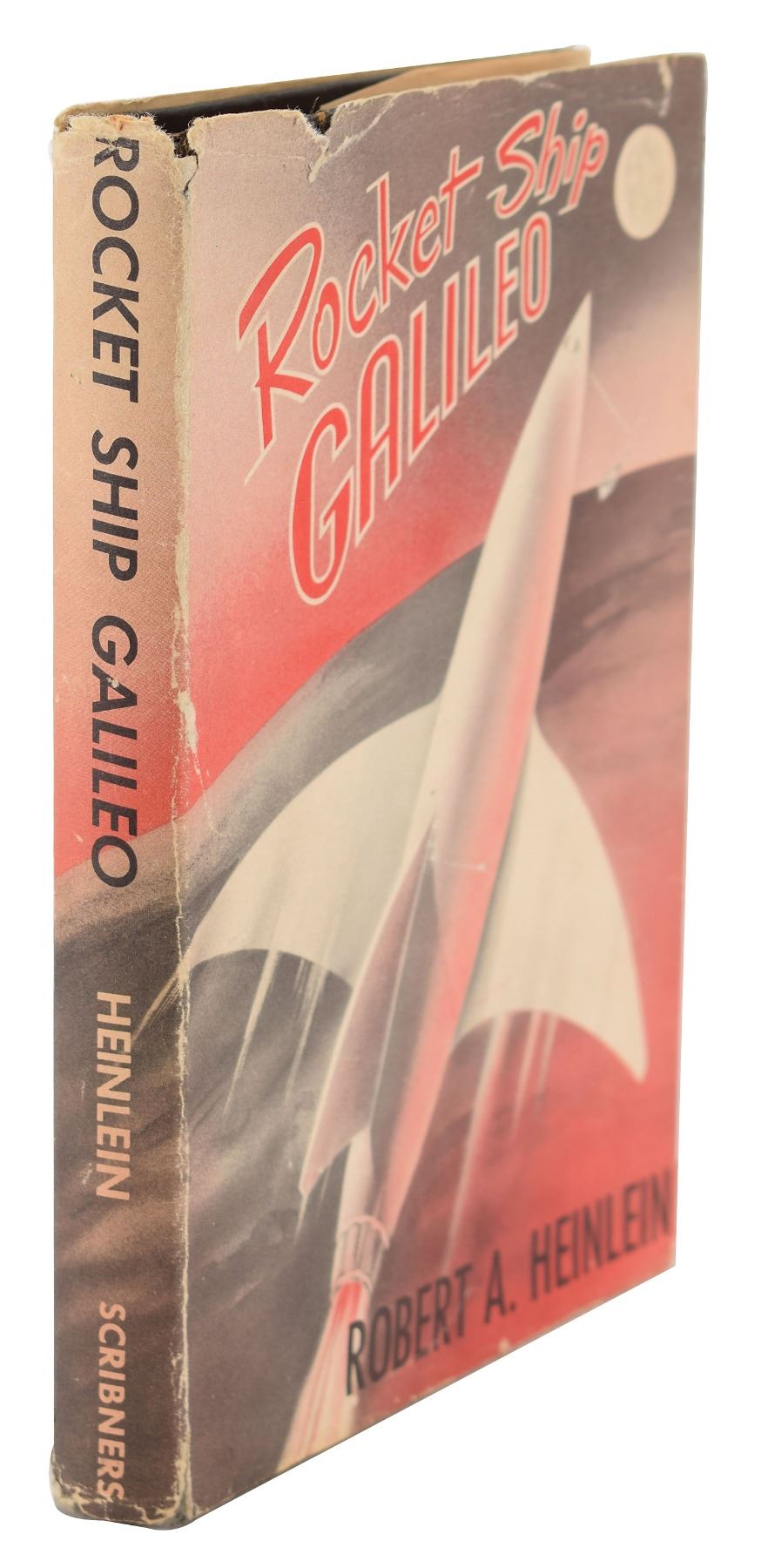 Sought-after first edition book: Rocket Ship Galileo. First edition. NY: Charles Scribner's Sons, 1947. Hardcover with price-clipped dust jacket, 5.75 x 8.25, 212 pages. Book condition: VG/VG, with a large ding to the top edge of the front board, and a few small nicks and edge tears to the dust jacket. The first in the Heinlein juveniles, a long and successful series of science fiction novels published by Scribner's, Rocket Ship Galileo was initially rejected by publishers who deemed the concept of going to the Moon as too far-fetched.