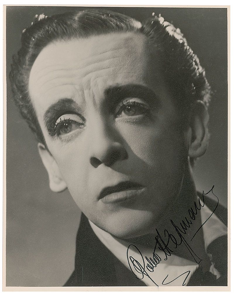 Australian dancer, actor, theatre director, and choreographer (1909–1986). Matte-finish 7.5 x 9.5 close-up photo of Helpmann, signed in black felt tip. A few surface creases, paperclip impression to the lower edge, and slightly trimmed edges, otherwise fine condition.