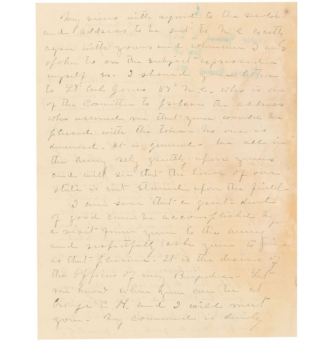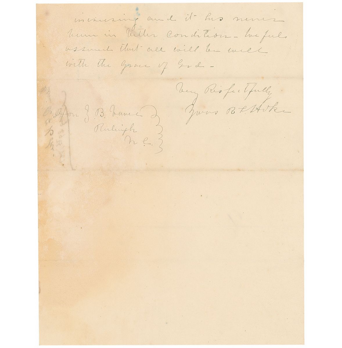 Civil War–dated ALS signed “R. F. Hoke,” three pages both sides, 7.5 x 9.75, Headquarters, Hoke’s Brigade, August 29, 1863. Letter to Governor Zebulon Baird Vance of North Carolina. In full: “Your welcome letter was a few days ago received. I am under many obligations for the trouble you have taken about the supplies for my command. By some means a small supply and burl cut of clothing was sent me. It is very important at present that every attention should be paid to the wants of our men from N. C. so as to give no reason for dissatisfaction. I was greatly in hopes that the European goods would have been issued in order to get our men in uniform to give them state and brigade pride. I will send immediately to Richmond to see if I can supply the deficiency. My men are in fine health and good spirits. The amount of under clothing sent me was ample and good in quality. My views with regard to the resolution and address to be sent to N. C. exactly agree with yours and whenever I was spoken to on the subject expressed myself so. I showed your letter to Lt. Col. Jones 57th N. C. who is one of the committee to prepare the address who assured me that you would be pleased with the tone. No one is demurred. It is general. We all in the Army rely greatly upon you and will see that the honor of our state is not stained upon the field. I am sure that a great deal of good can be accomplished by a visit from you to this Army and respectfully ask you to give us that pleasure. It is the desire of the officers of my brigade. Let me know when you can be at Orange C. H. and I will meet you. My command is daily increasing and it has never been in better condition. We feel assured that all will be well with the grace of God.” Dampstaining to the left portion of the letter (somewhat affecting the overall appearance but not the legibility or boldness of ink), otherwise fine condition.