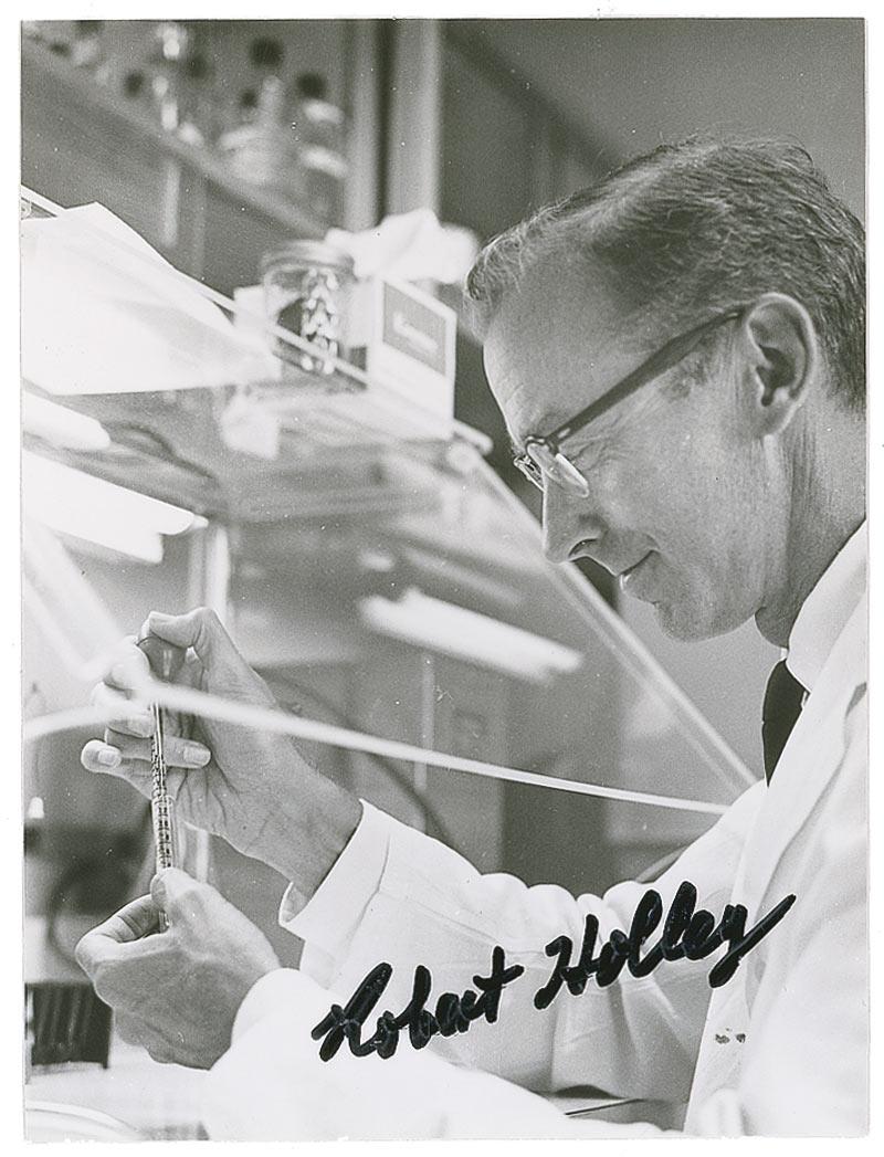Biochemist (1922–1993) who shared the 1968 Nobel Prize in Physiology or Medicine for his research linking DNA and protein synthesis. Glossy 3 x 4 candid photo of Holley working in the lab, signed in black felt tip. In fine condition.