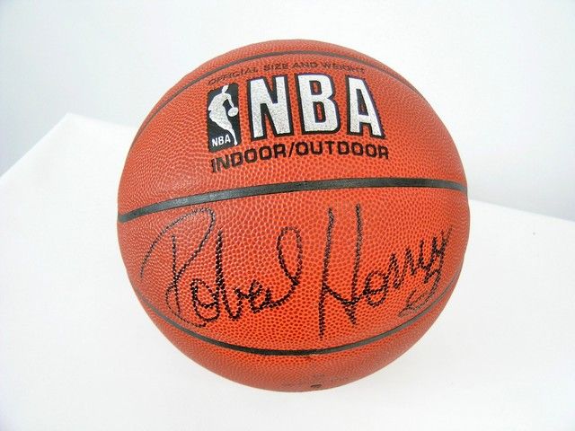 A signed basketball from Robert Horry, championship NBA player and current sports commentator. Signed on an NBA indoor/outdoor official size and weight basketball.
