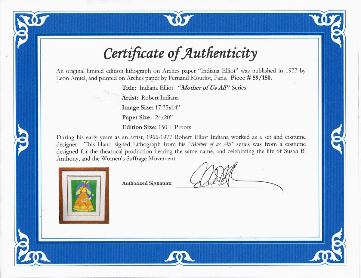During his early years as an Artist , 1966-1977 Robert Elliot Indiana worked as a set and costume Designer . This hand signed lithograph from his "Mother of us All" series was from a costume designed for the theatrical production bearing the same name , and celebrating the life of Susan B. Anthony, and the Women's Suffrage Movement . An original Limited Edition lithograph on Arches paper, Indiana Elliot was published 1977, in an Edition of 150, plus proofs. Paper Size: 24" x 20." Signed & numbered in pencil. It was published by Leon Amiel, and Printed on arches paper by Fernand Mourlot, Paris. Excellent Condition; Conservation framed With Certificate of Authenticity included. Suggested Retail Gallery Price: $1,250.He is known for using public signs and symbols with altered lettering to make stark and challenging visual statements. In his paintings and constructions he has given new meaning to such basic words as "Eat", "Die" and "Love." Using them in bold block letters in vivid colors, he has enticed his viewers to look at the commonplace from a new perspective. One indication of his success was the appearance of his immensely popular multi-colored "Love" on a United States postage stamp in 1973.