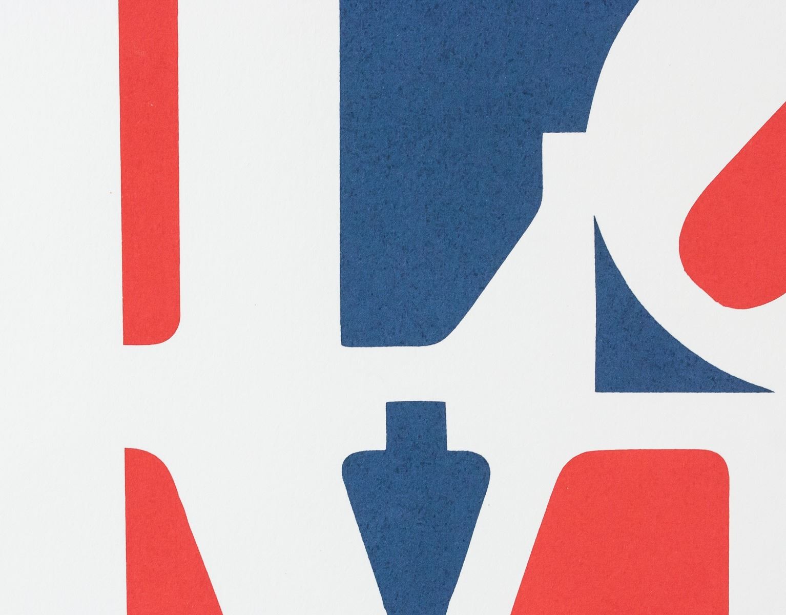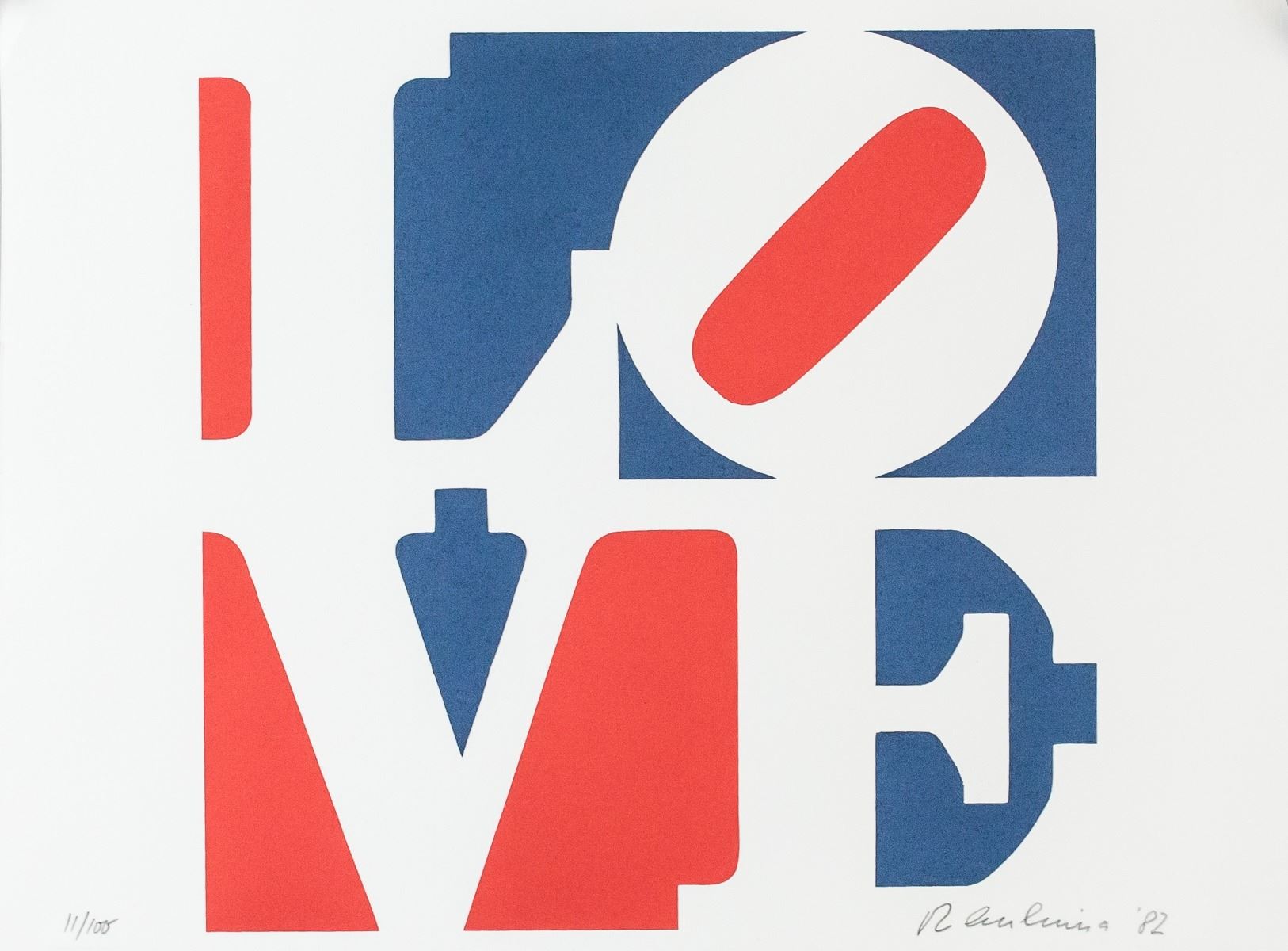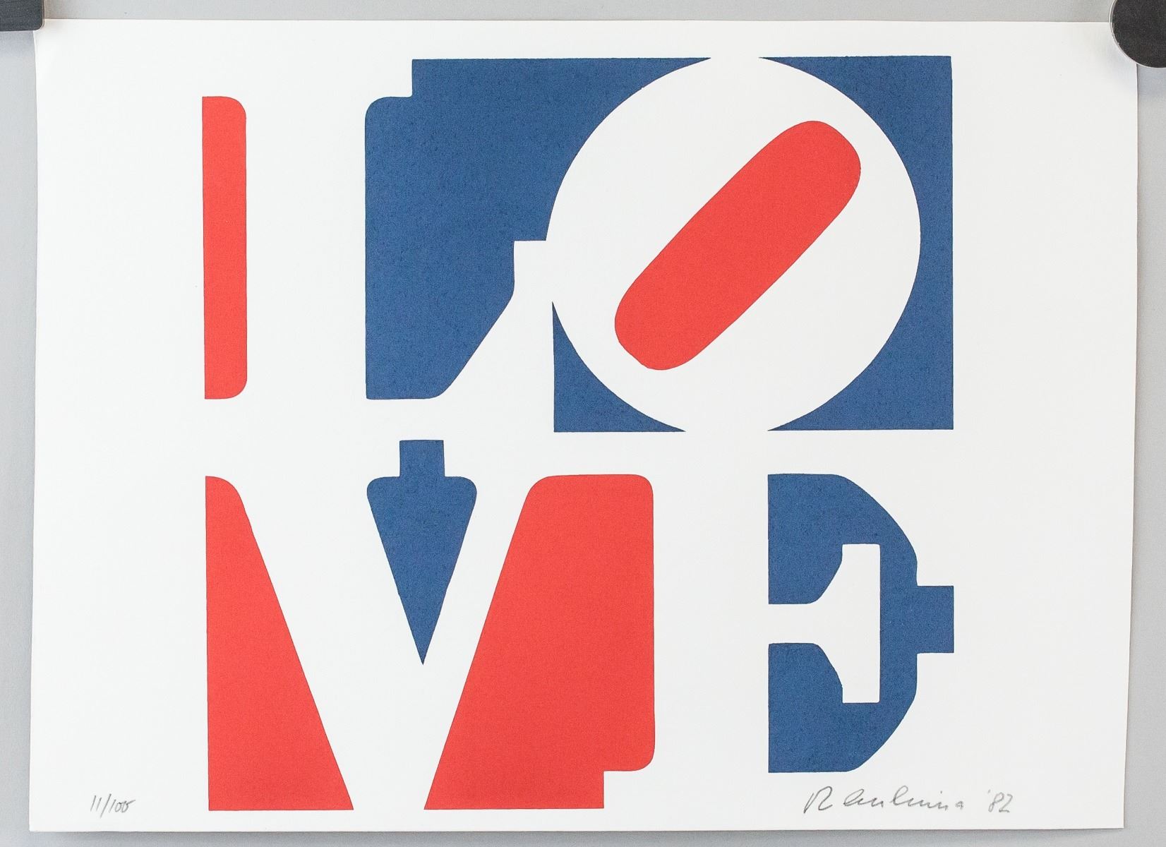 Lithograph on paper. Featuring stylised image of "LOVE". Signed "R Indiana" in the bottom right corner with "82" inscribed beside the signature. "11/100" inscribed in the bottom left corner. "VIII R1-607" inscribed on verso. Stamped with "INTERNATIONAL IMAGES NEW YORK". Attributed to Robert Indiana (1928-2019, American). 21.5 x 29 cm (8.5 x 11.5 inches)