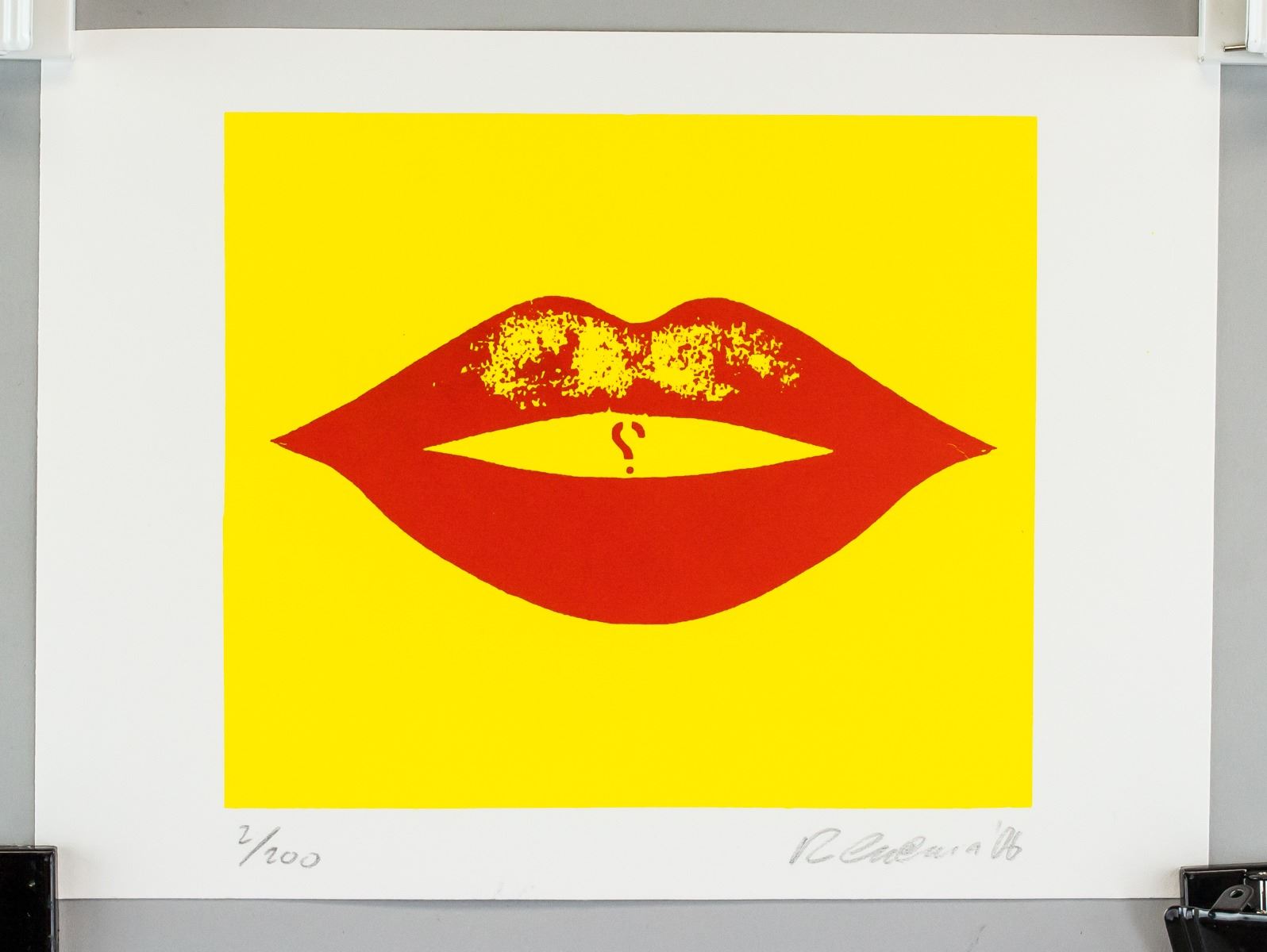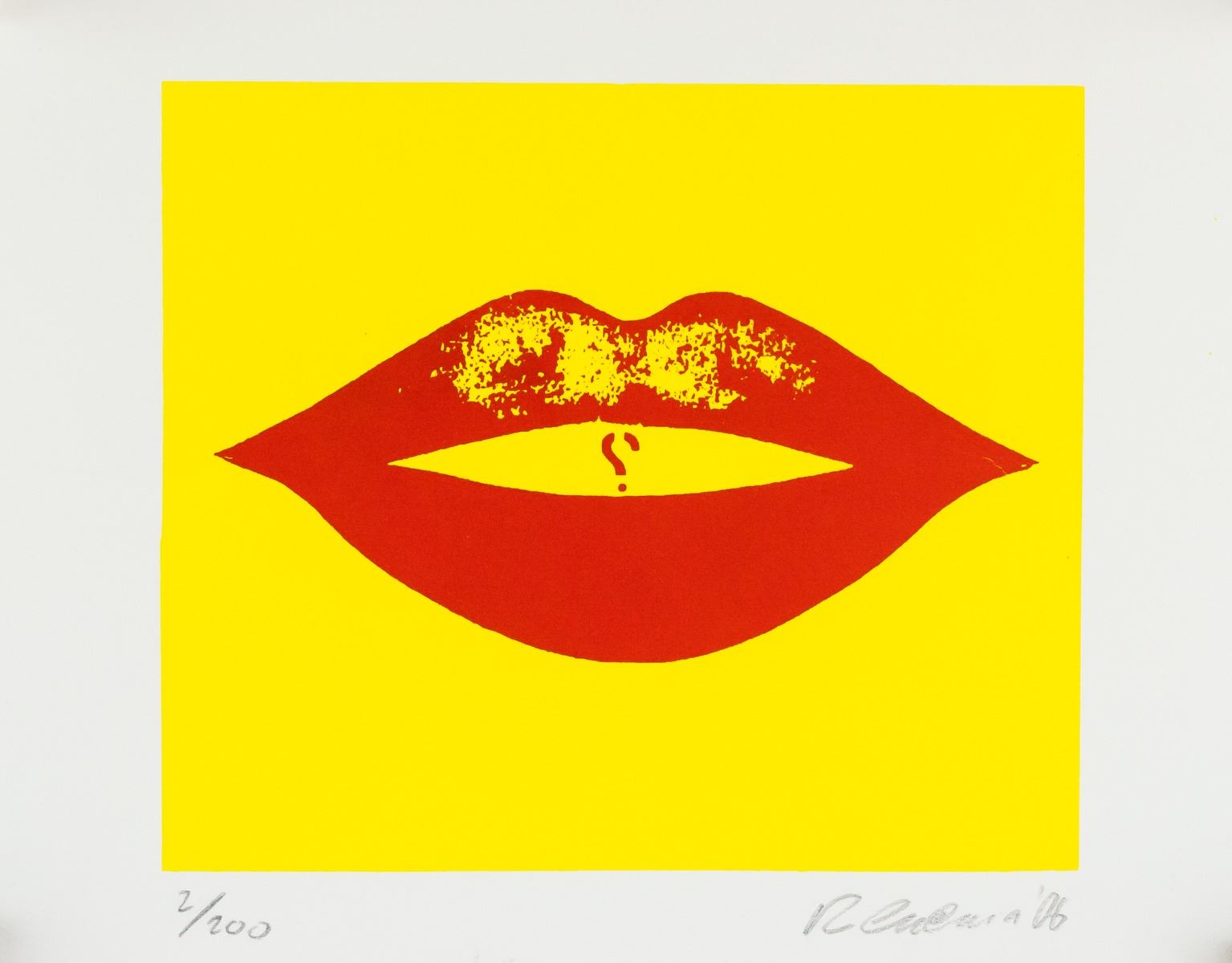Serigraph on paper. Featuring lips with a question mark. Signed R. Indiana '06 and inscribed 2/200 on the lower right and lower left corner, respectively. Inscribed VI / RI-751 on verso. Stamped INTERNATIONAL IMAGES NEW YORK on verso. Attributed to Robert Indiana (1928-2018, American). 21 x 29 cm (8.25 x 11.5 inches). PROVENANCE: Southern Ontario estate
