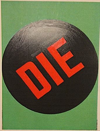 In the manner of Robert Indiana "Die" oil on canvas circa.1967, private collection approx. 29x24in. Indiana is an American artist associated with the pop art movement. His "LOVE" print, first created for the Museum of Modern Art's Christmas card in 1965, was the basis for the widely distributed 1973 United States Postal Service "LOVE" stamp. His media include paper (silk screen) and Cor-ten steel sculpture.