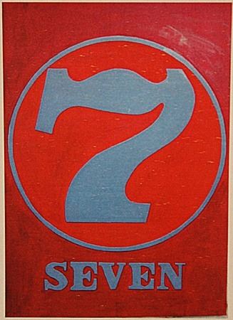 In the manner of Robert Indiana "Seven" oil on canvas circa.1970, private collection approx. 28x20in. Indiana is an American artist associated with the pop art movement. His "LOVE" print, first created for the Museum of Modern Art's Christmas card in 1965, was the basis for the widely distributed 1973 United States Postal Service "LOVE" stamp. His media include paper (silk screen) and Cor-ten steel sculpture.