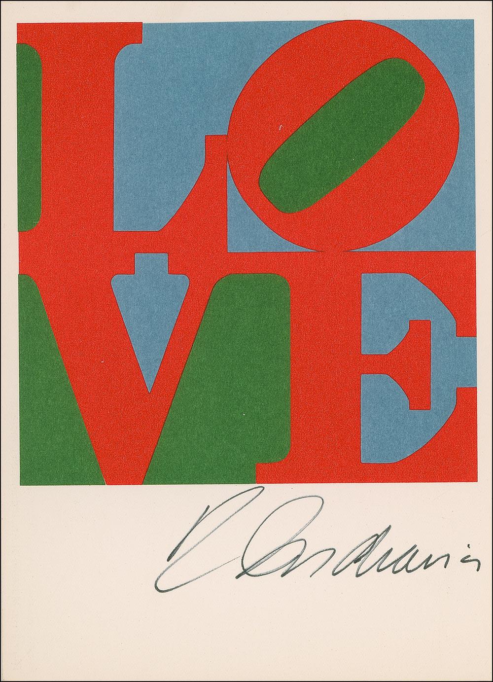 American artist associated with the Pop Art movement. Color 4.75 x 6.5 postcard photo of Indiana’s ‘Love’ work, signed in the lower border in black felt tip. In fine condition.