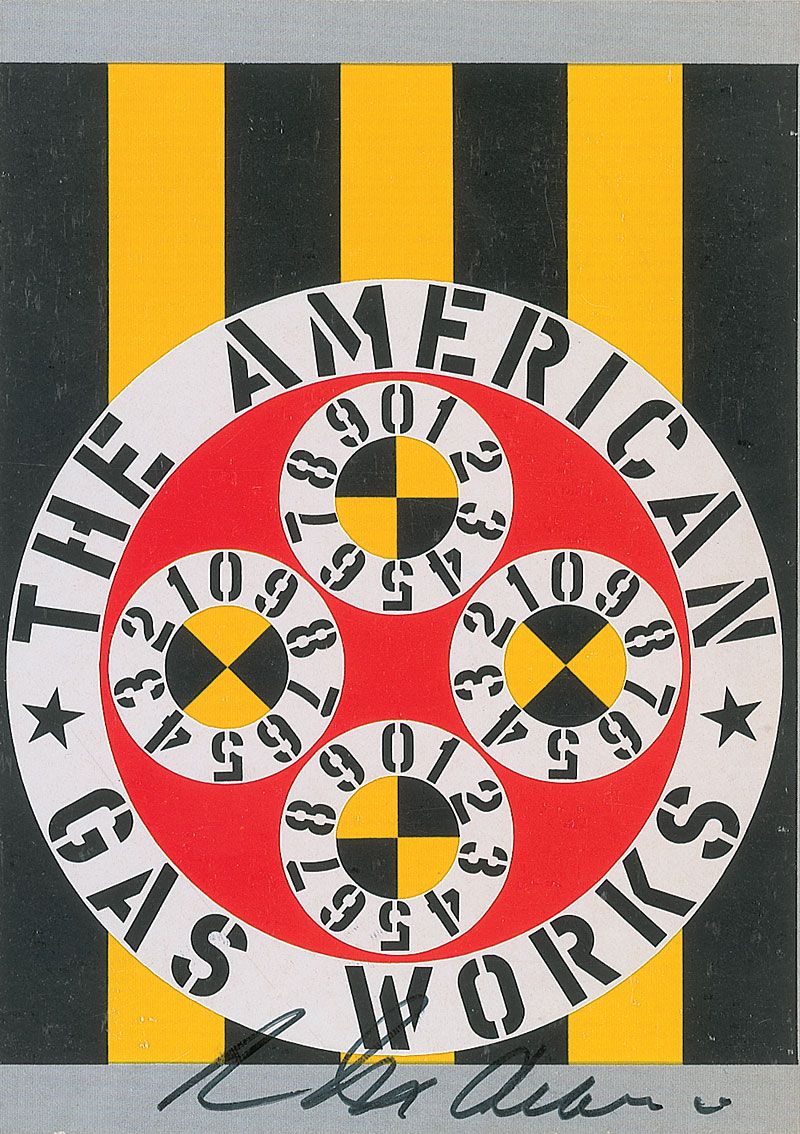 Two color postcards of Indiana’s works, both 4 x 5.75, each signed on the front in black felt tip, “R. Indiana.” In fine condition, with a few scattered light surface marks and a fingerprint to one signature.