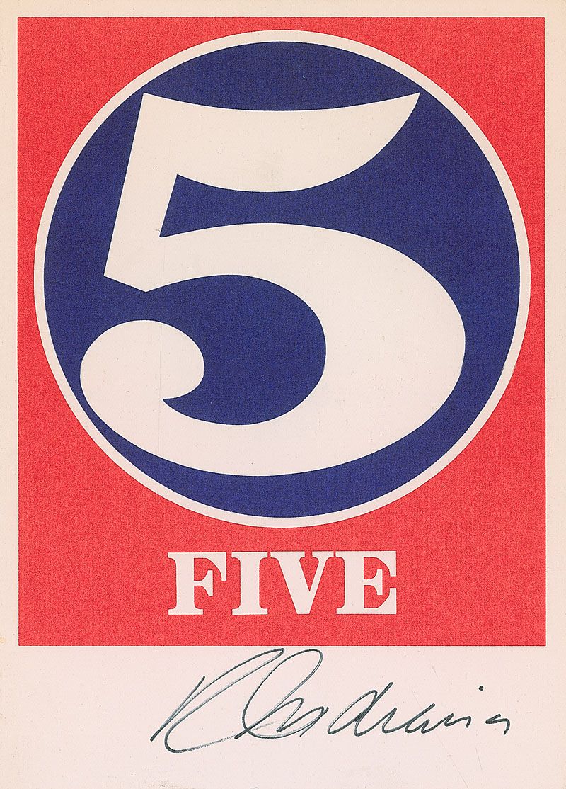 Color postcard of Indiana’s 1965 work entitled ‘Five,’ 4.5 x 6.5, signed in the lower border in black felt tip, “R. Indiana.” In fine condition.