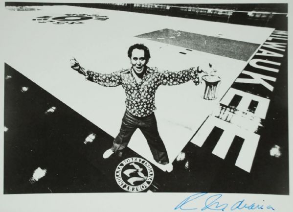 ROBERT INDIANA (1928 – 1998) American Artist. Pop Art Movement. Best known for “LOVE” image which was first created for a Christmas card for the Museum of Modern Art in 1964. In 1973, the image was on an 8 cent postage stamp. Glossy 10? x 8? photo of Indiana holding a paint can on a basketball court, signed in blue felt tip “R Indiana”. In fine condition.